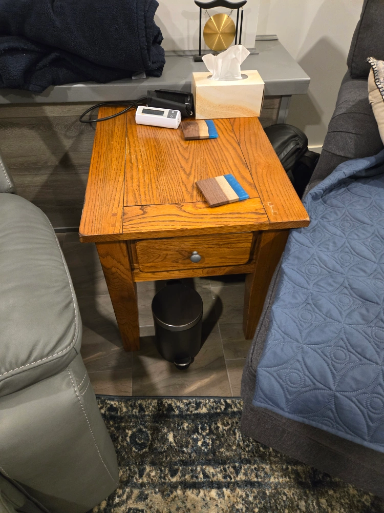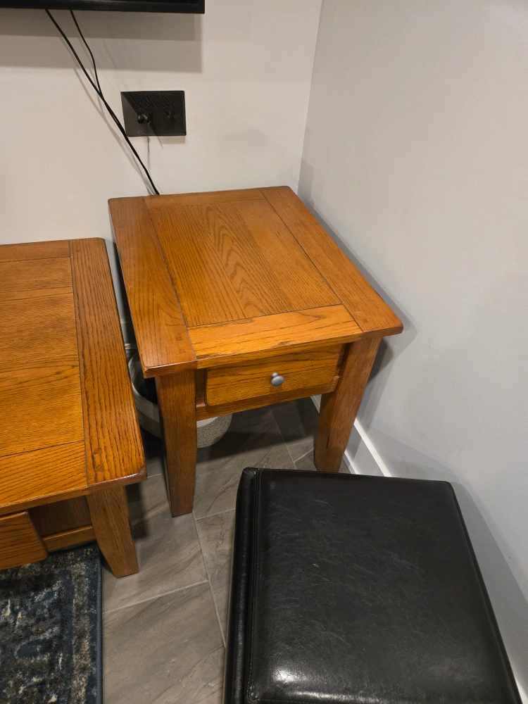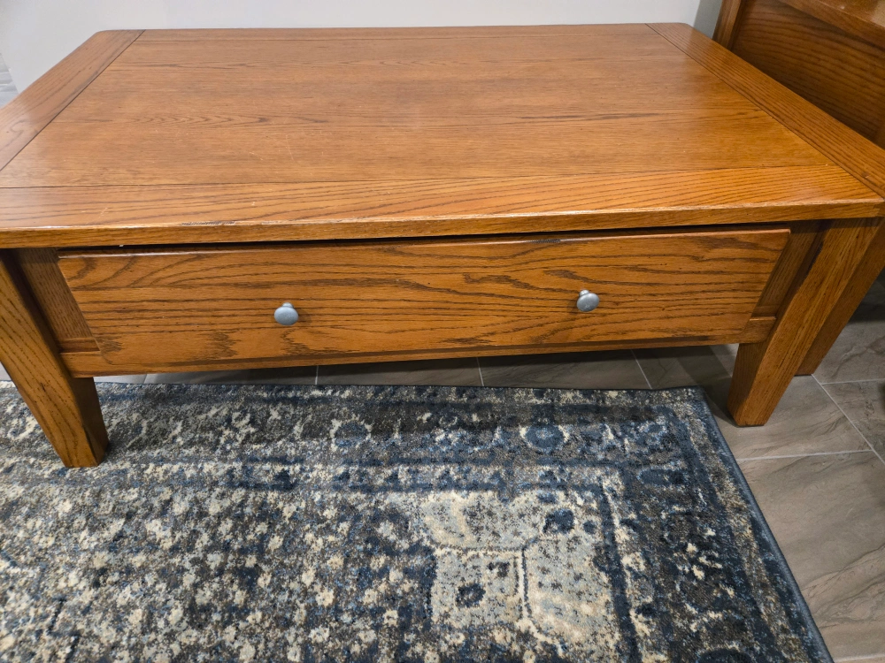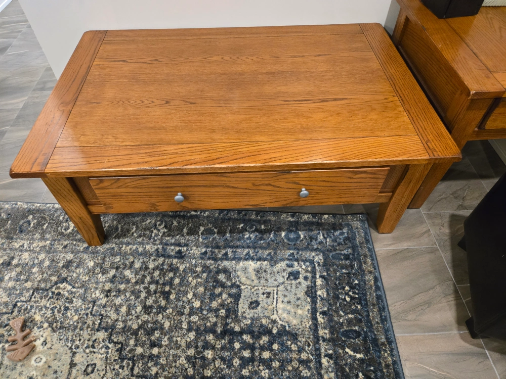 Selling a matching set of solid oak coffee table and end tables. They are in good condition with a classic design. Perfect for living room or family room. table - 52x34x19 inches end tables 28x22x24 inches pickup only but can help load