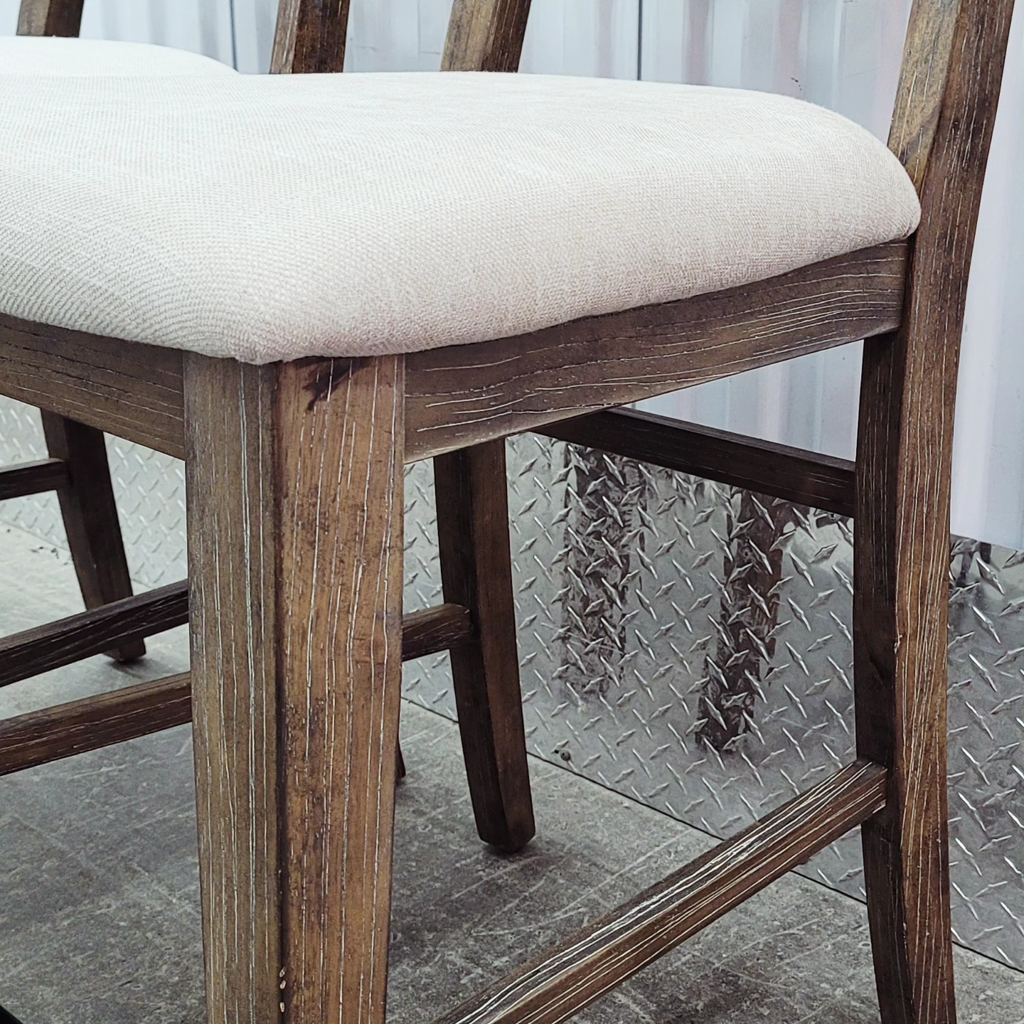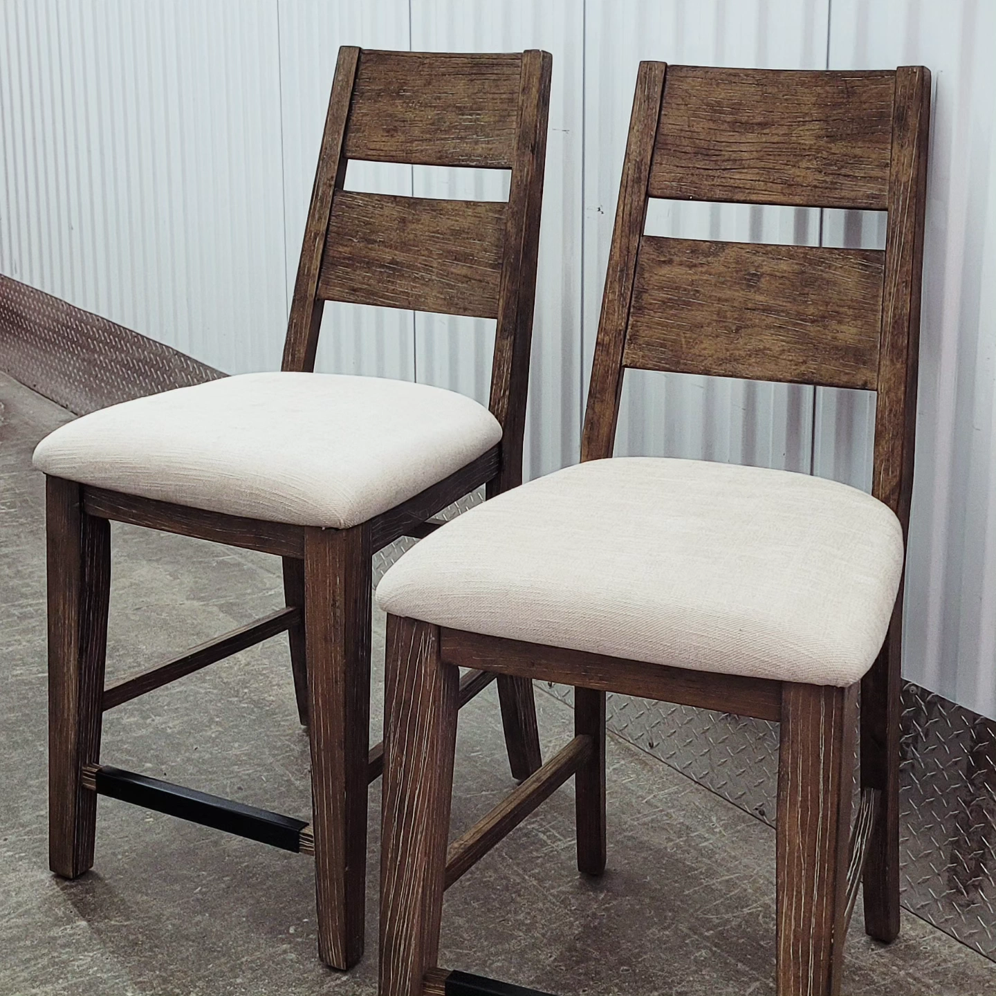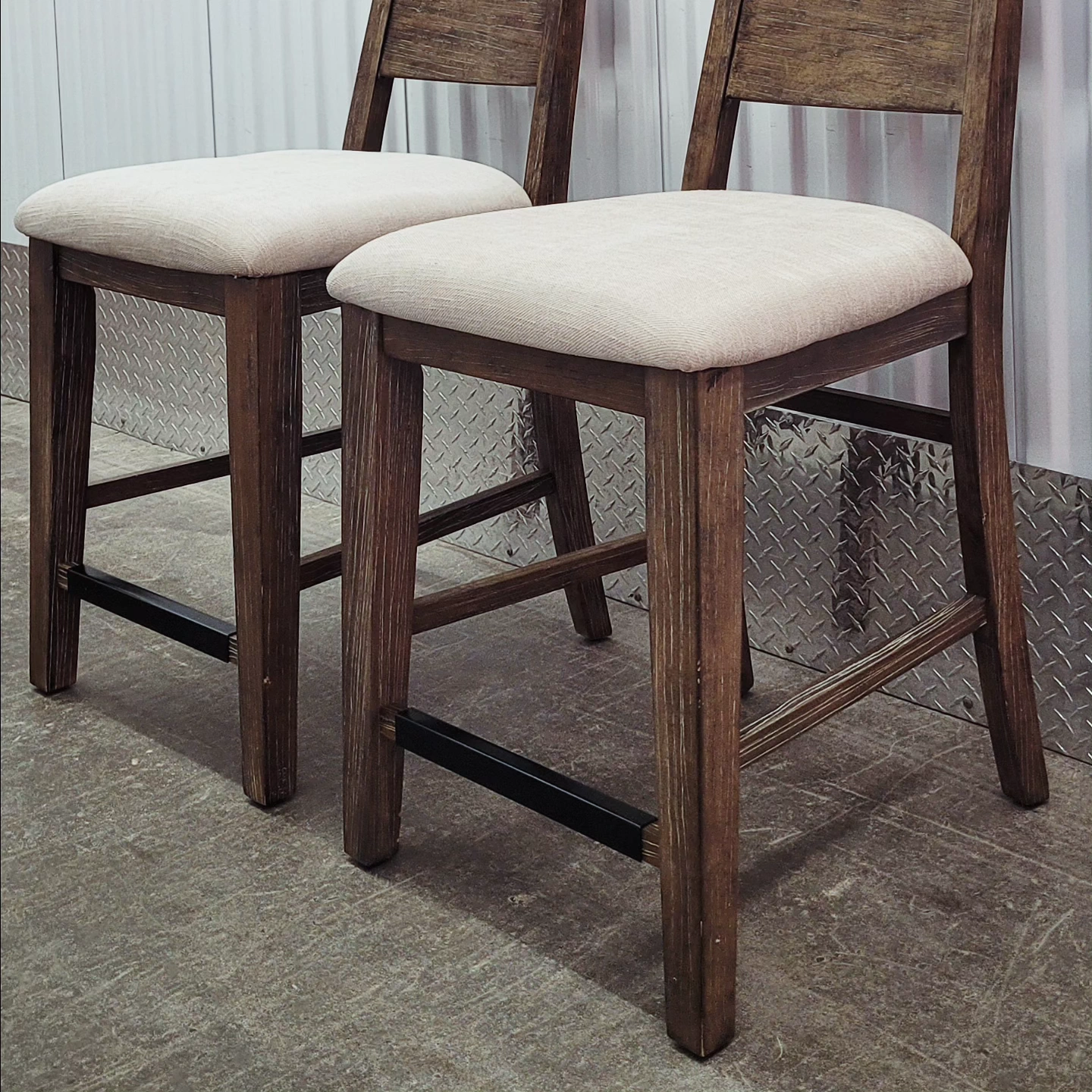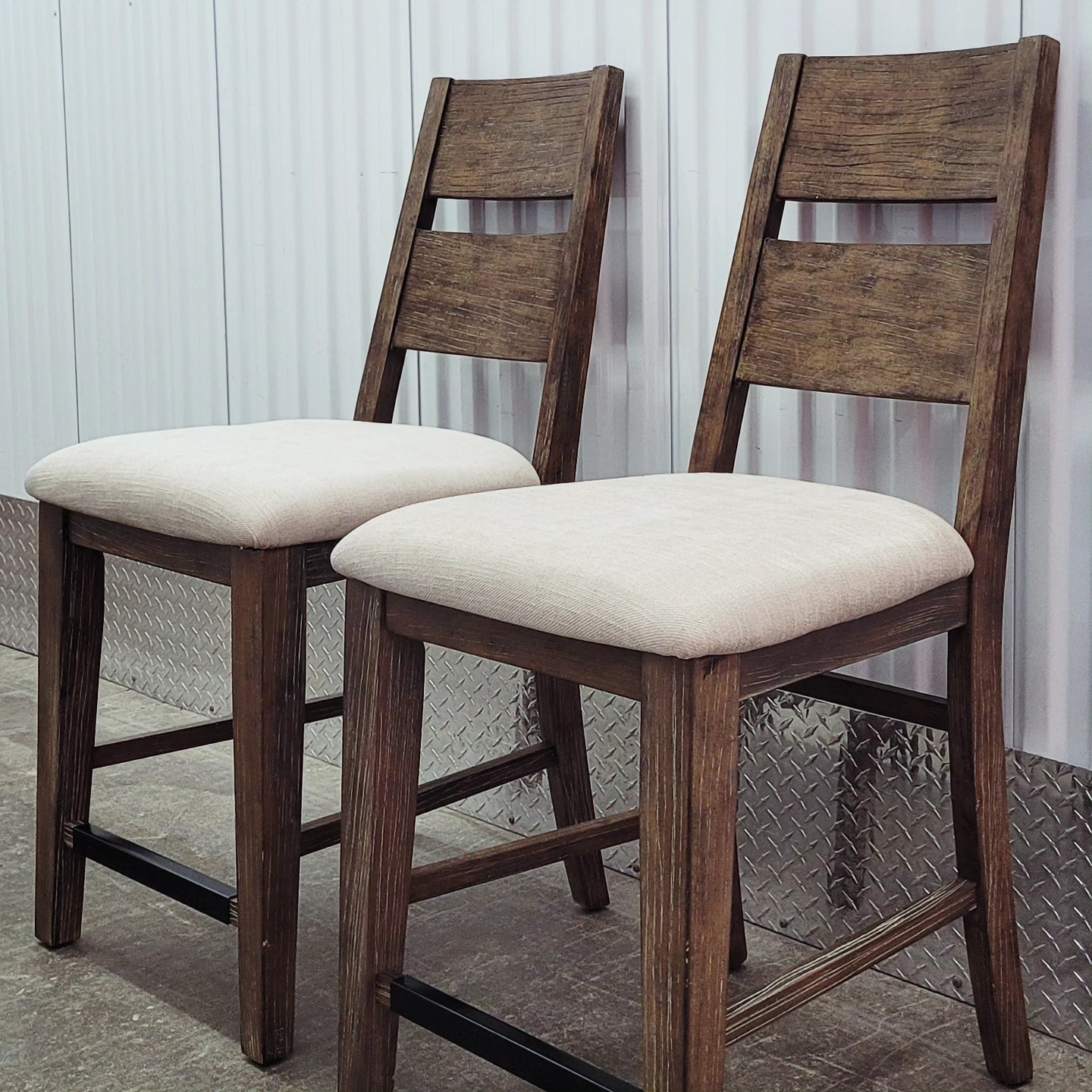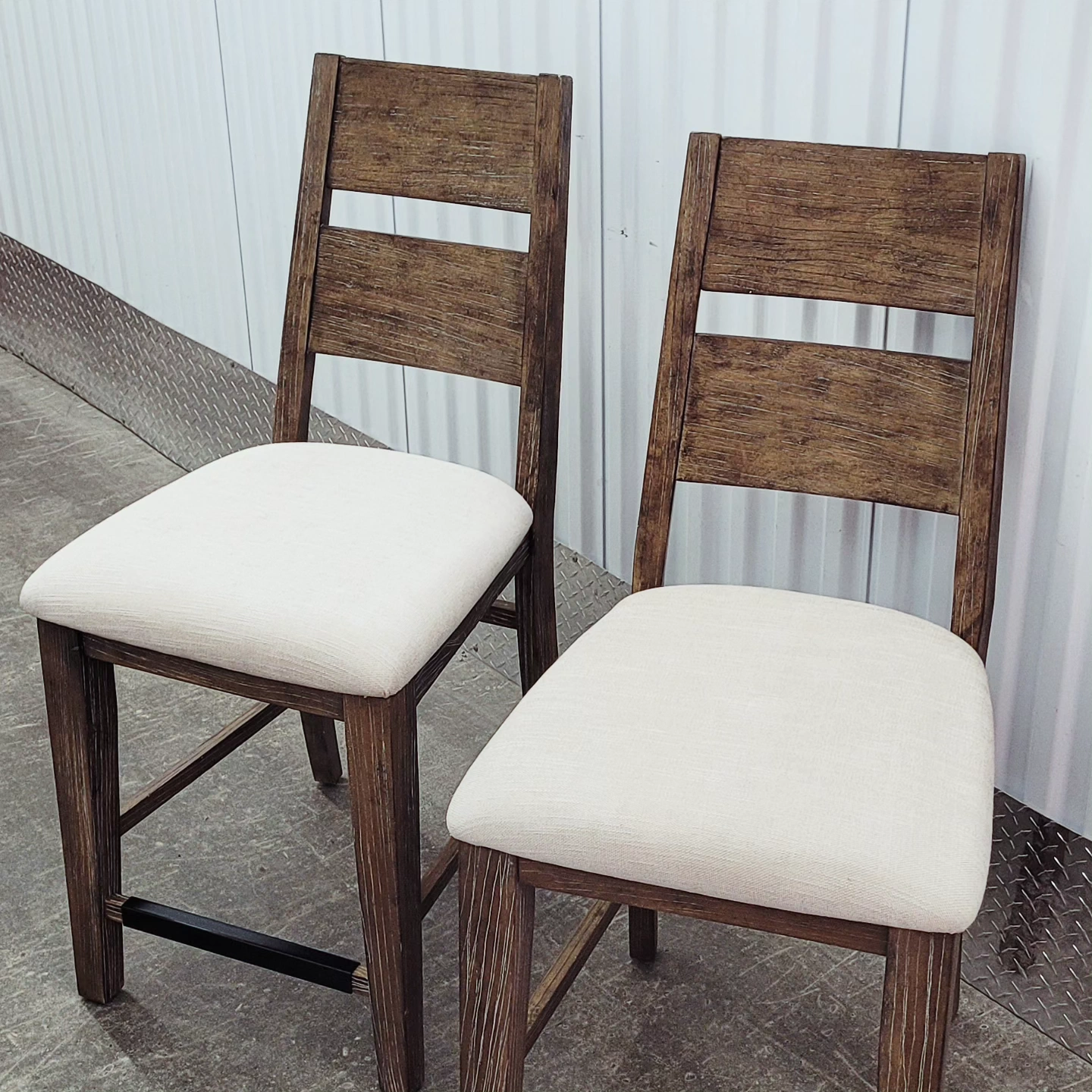 Set of 2 counter height bar stools. The stools are distressed white rubbed solid oak with padded off white seats and has never been used. Purchased for over $500 each but selling only $375 for the pair. Measurements in inches " Total height 42" Floor to seat 24" Width 19" Depth 19" Back rest Height 19"