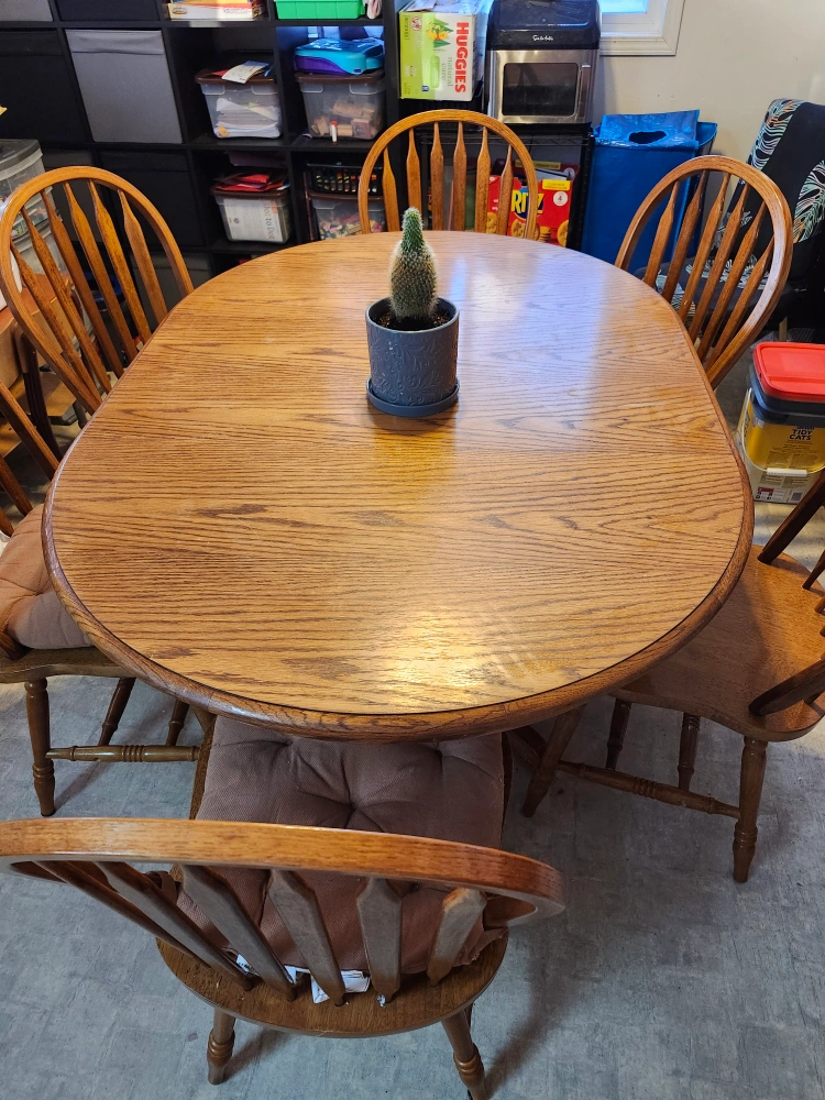 67Oval oak dining table and six matching chairs. Table has a leaf. some chairs have seat pads(4) good condition, some wear. pu grunthal asap, can deliver for an extra fee. fcfs