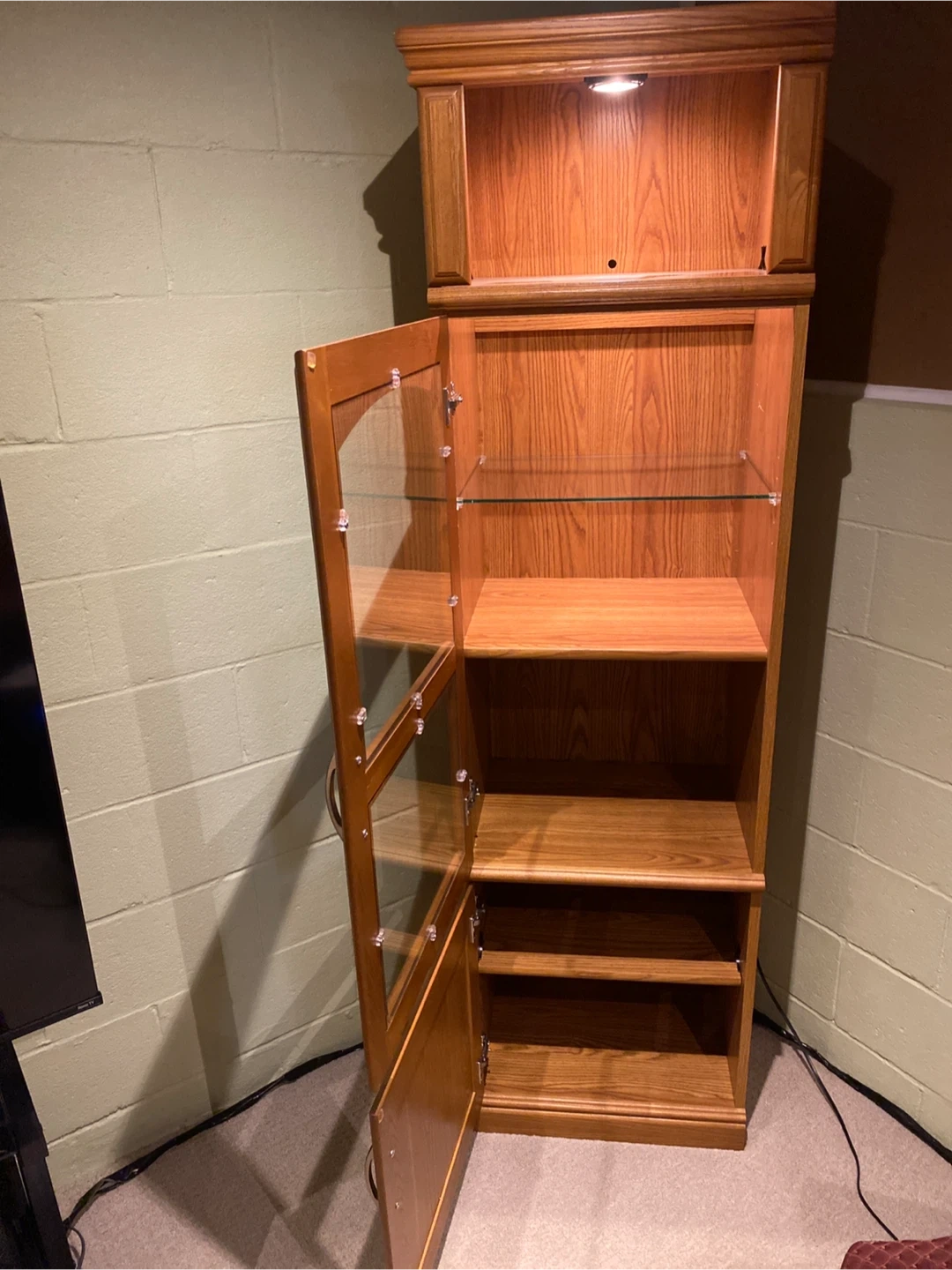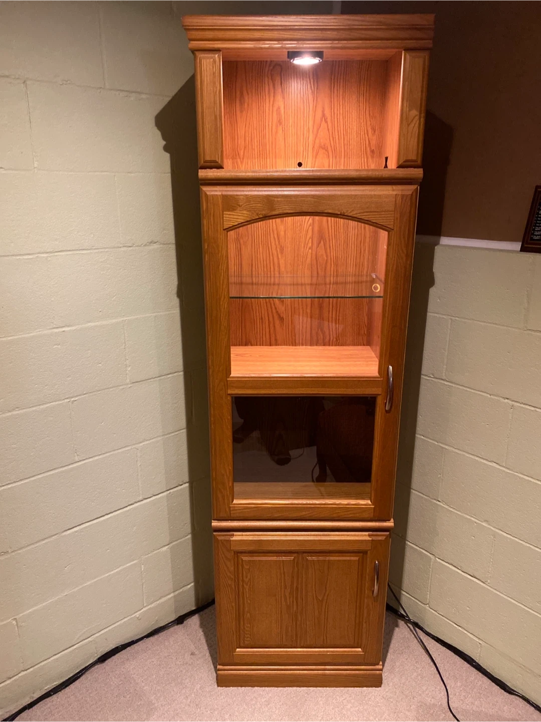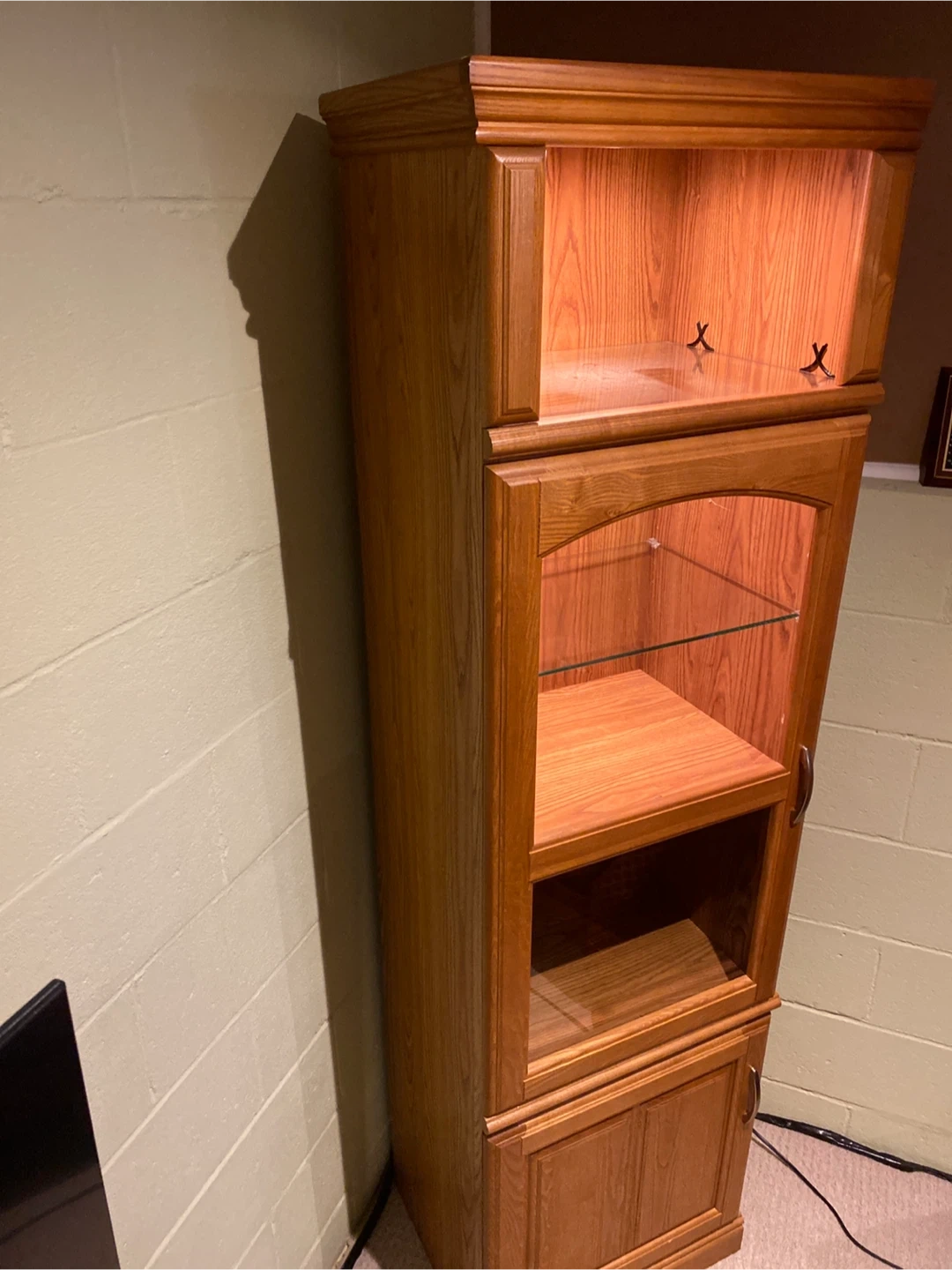 Here's a lovely oak display cabinet with glass doors! It's perfect for showcasing your favourite items. The cabinet features a light in the top section and adjustable glass shelves. It is in great condition and ready for a new home!