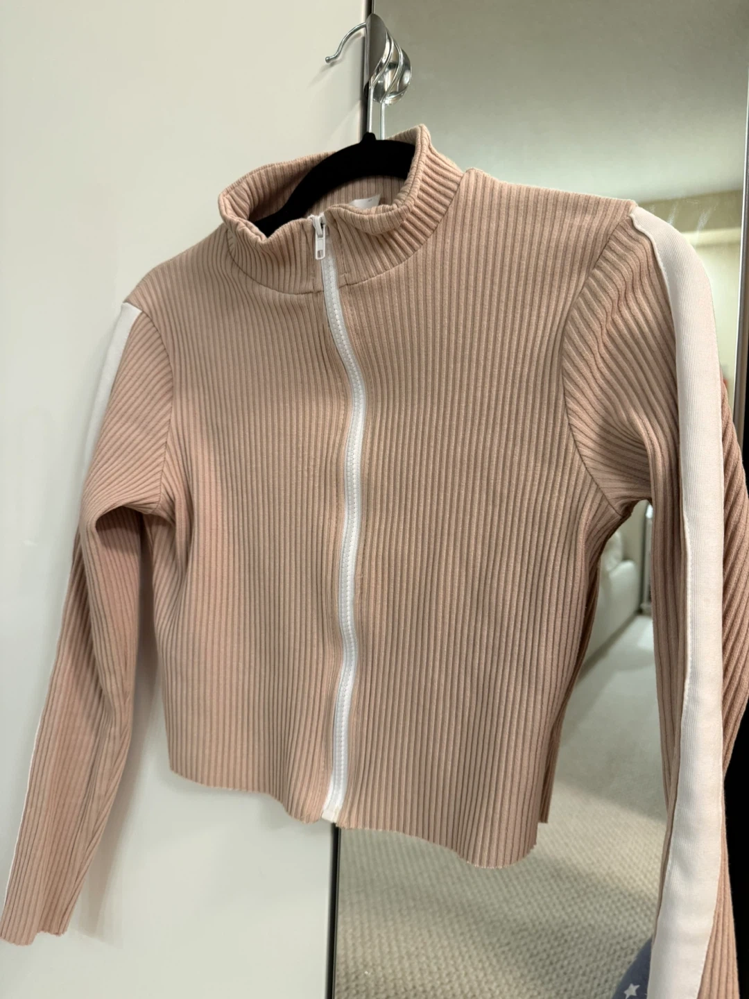 1000+Selling a cute Oak + Fort ribbed jacket! It's a size S/P and features a full zipper. The jacket is a light beige colour with a white stripe detail on the sleeves. Perfect for layering! In excellent condition