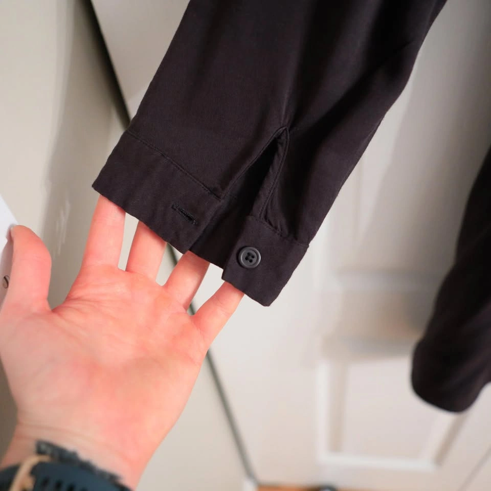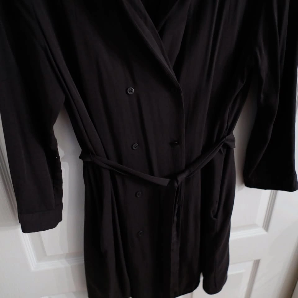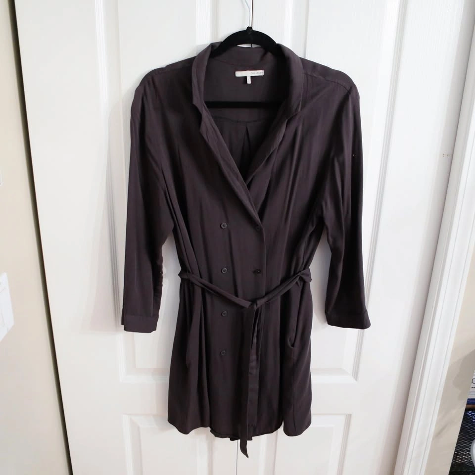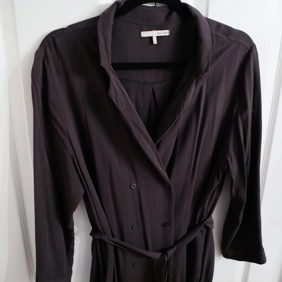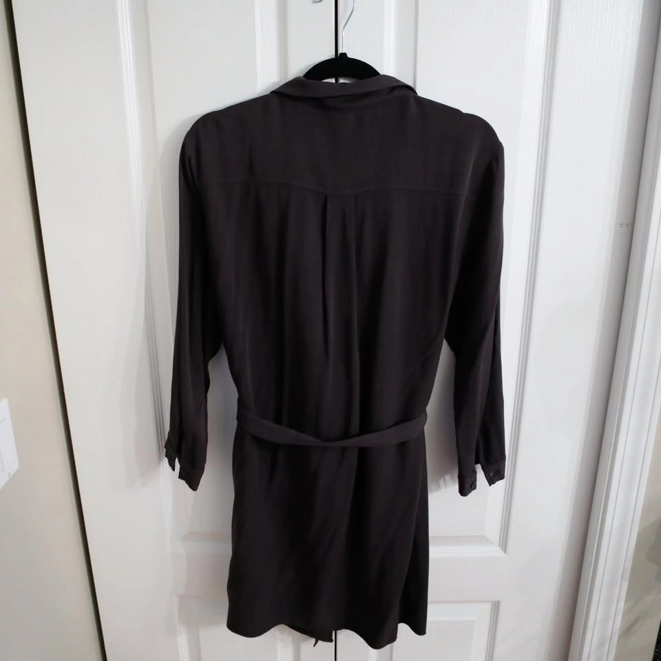 Super soft and comfy shirt dress in a dark, muted olive/grey colour - In excellent condition, pre-worn with no major flaws - 100% rayon - Size large - Mid-thigh to knee length: length through the centre back is 35",