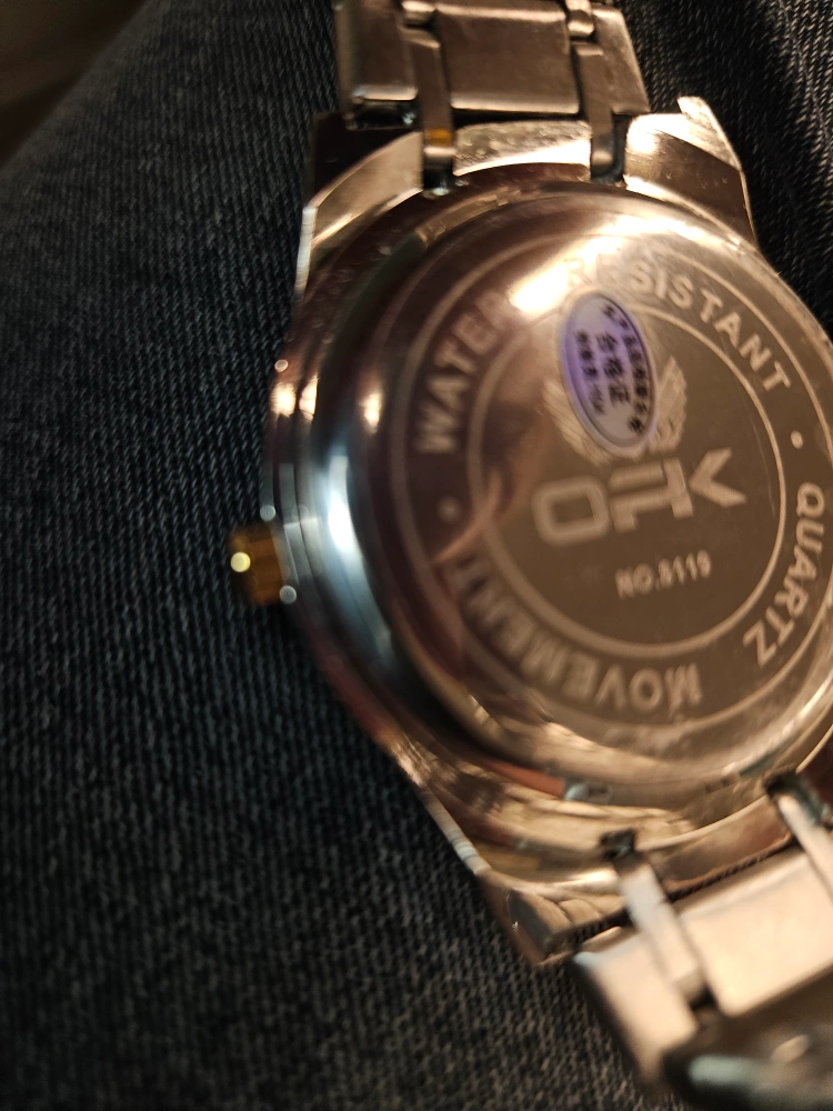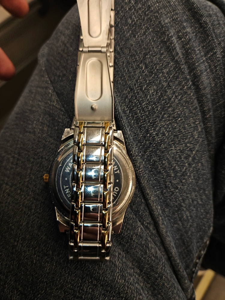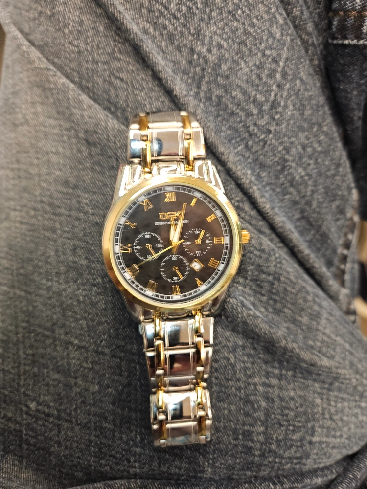 Selling a silver and gold OAK quartz watch. It's in good condition and has a nice weight to it. The watch features a detailed face with multiple subdials and a stainless steel band. A stylish accessory for any occasion!