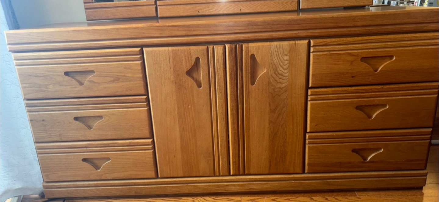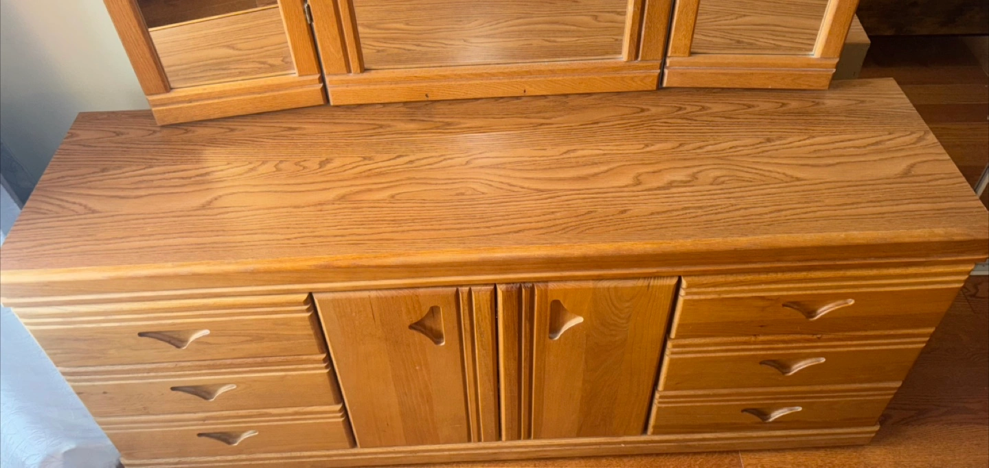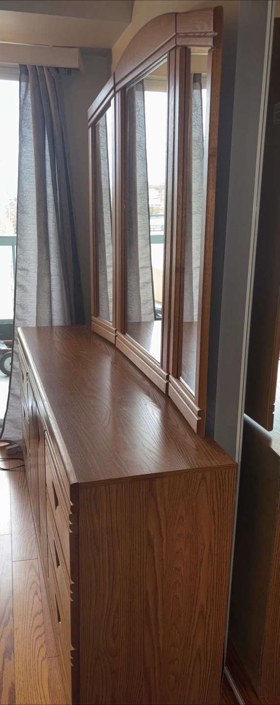 79Solid oak dresser and mirror. Six drawers and two doors. Tri-fold mirror. In great condition with few little stains from years of being used. Will definitely need at least 2 people to move it from condo to your vehicle. Pick up is Sheppard west near the ttc station.