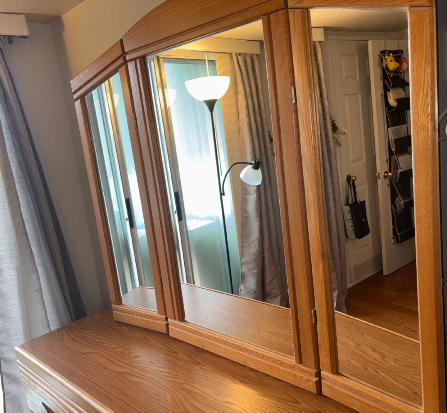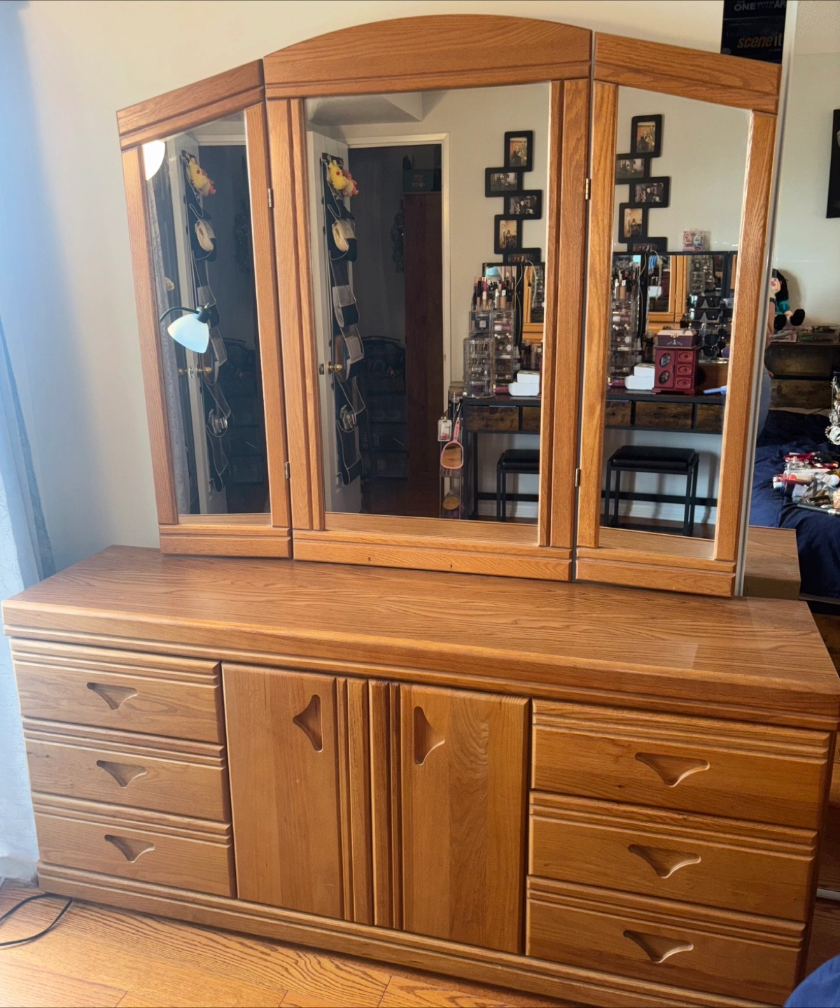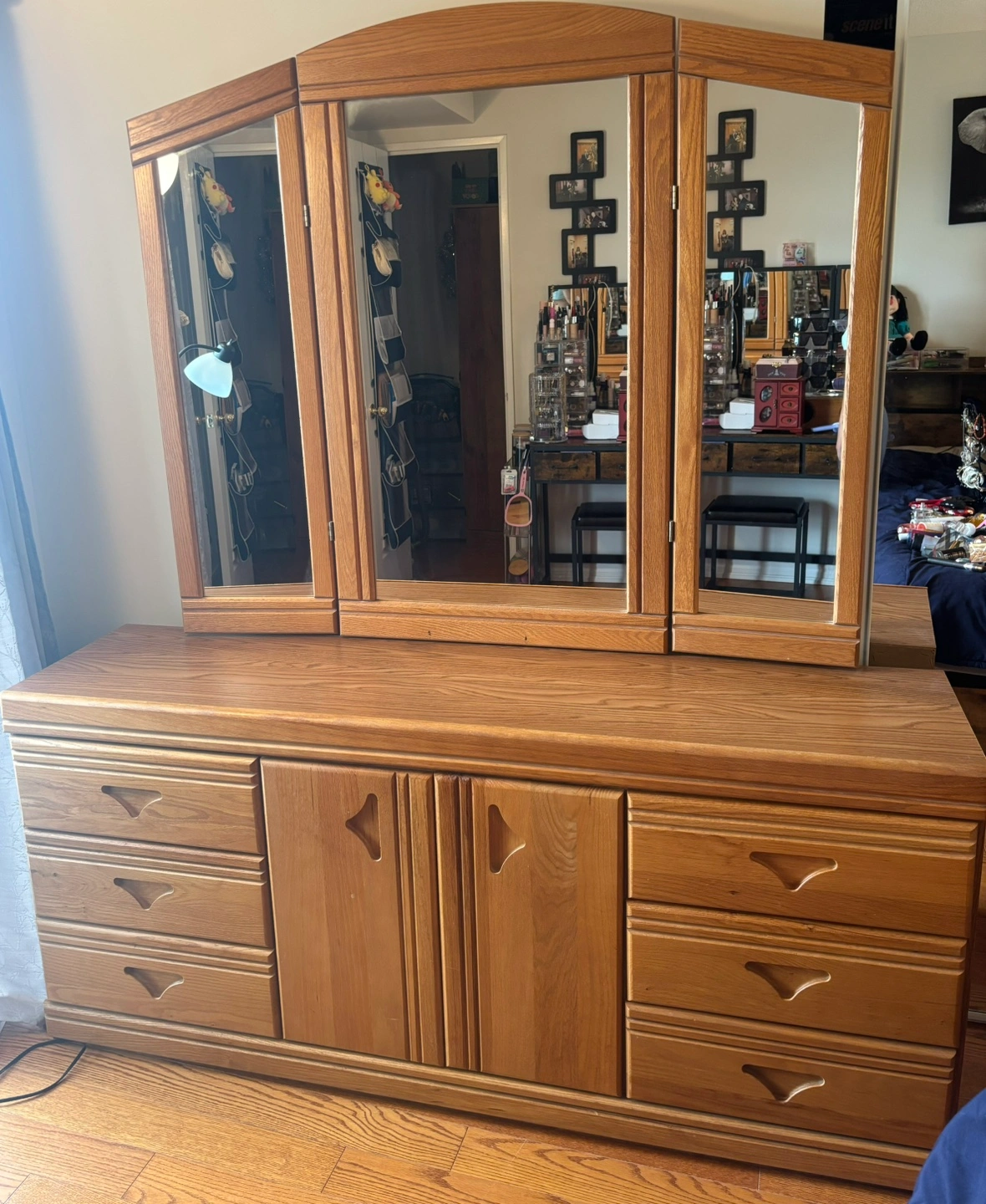 79Solid oak dresser and mirror. Six drawers and two doors. Tri-fold mirror. In great condition with few little stains from years of being used. Will definitely need at least 2 people to move it from condo to your vehicle. Pick up is Sheppard west near the ttc station.