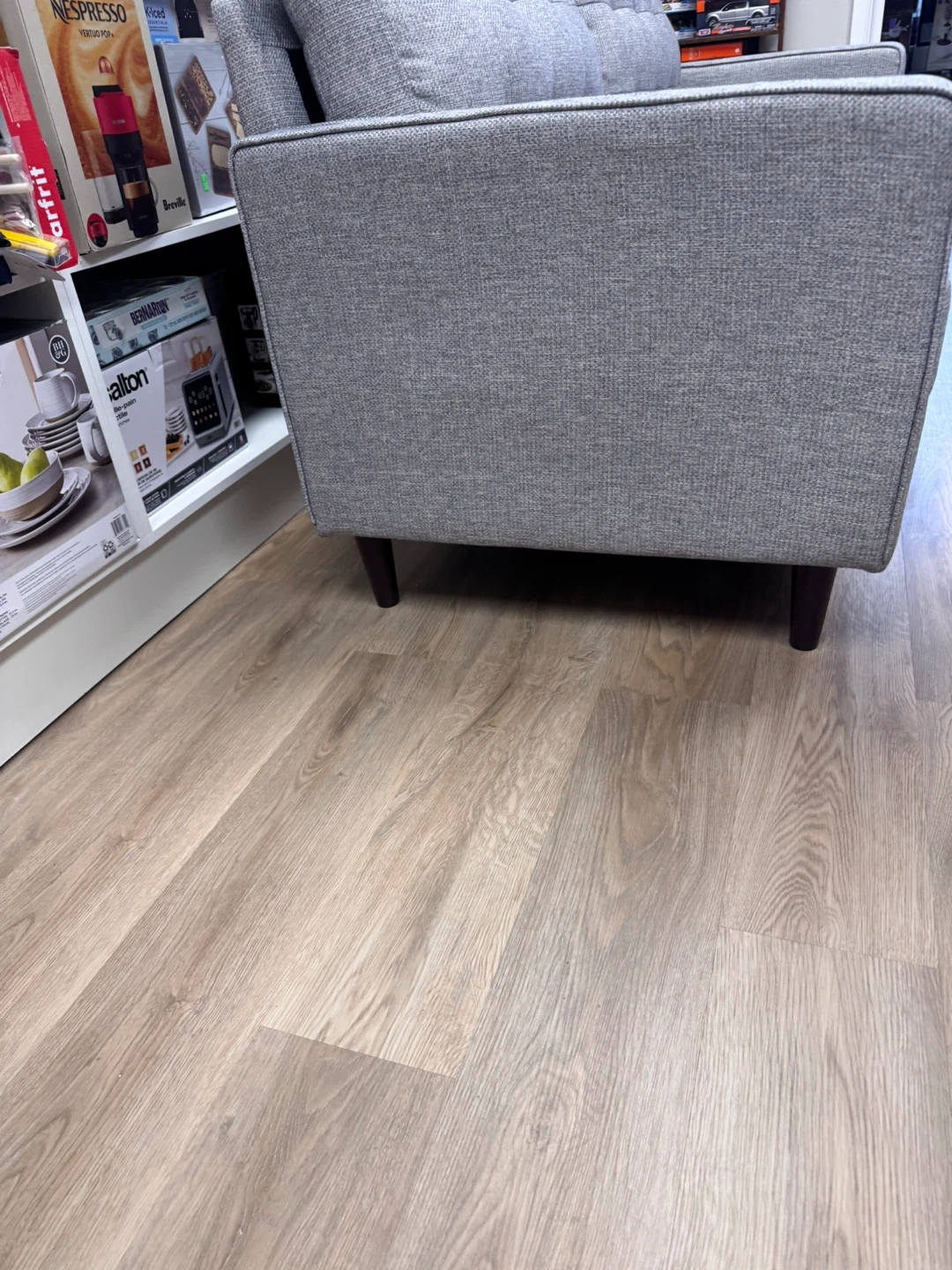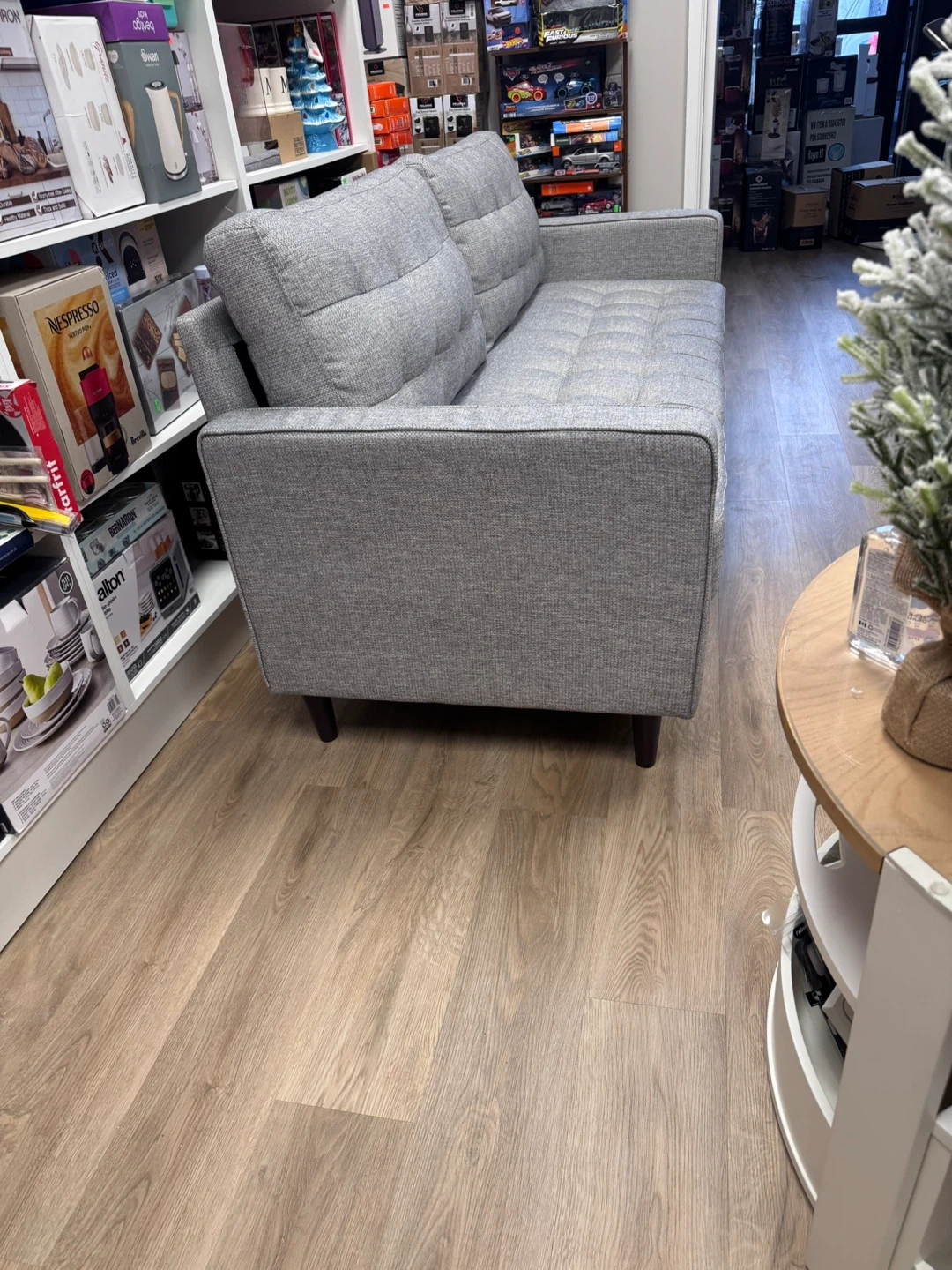 This is a modern two-seater sofa upholstered in grey fabric. It features tufted seat and back cushions with piping detail. The sofa stands on dark wooden legs.