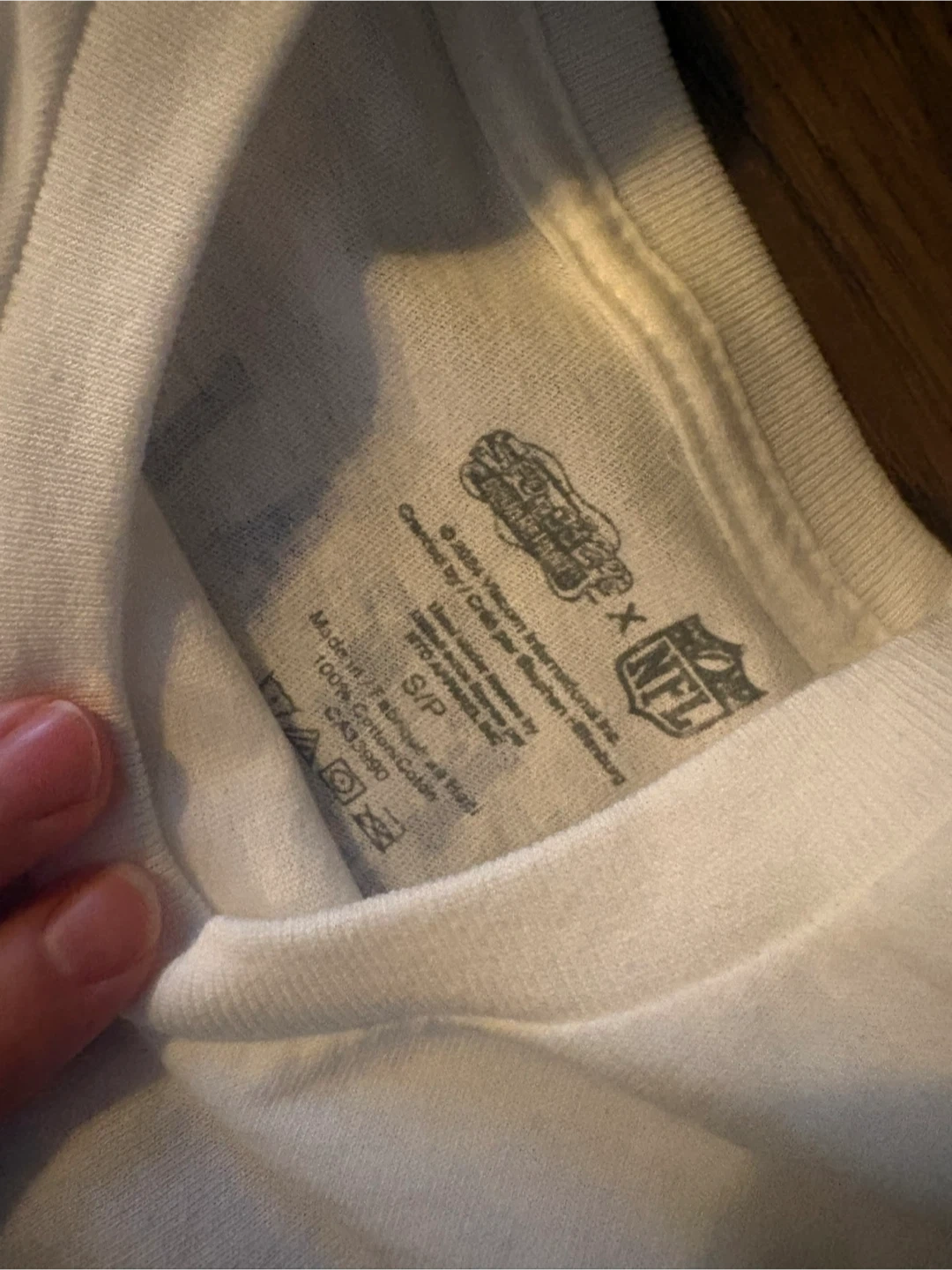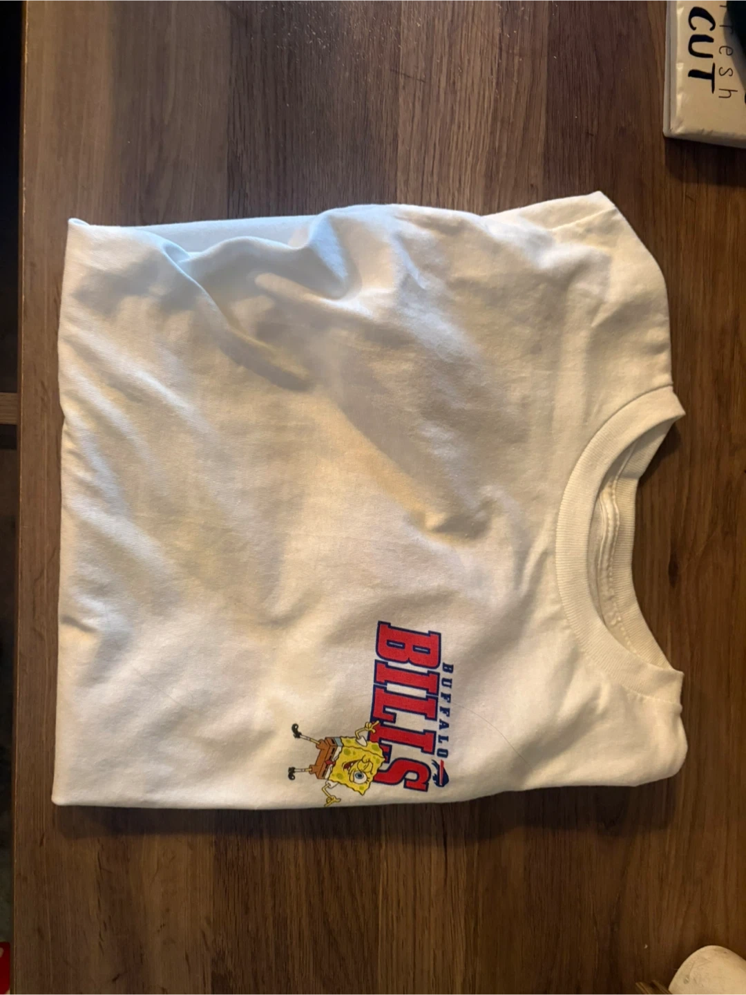 Selling a Spongebob Buffalo Bills t-shirt. It's a size small and made of 100% cotton. The shirt is in good condition and features a fun Spongebob design with the Buffalo Bills logo. Kids size small
