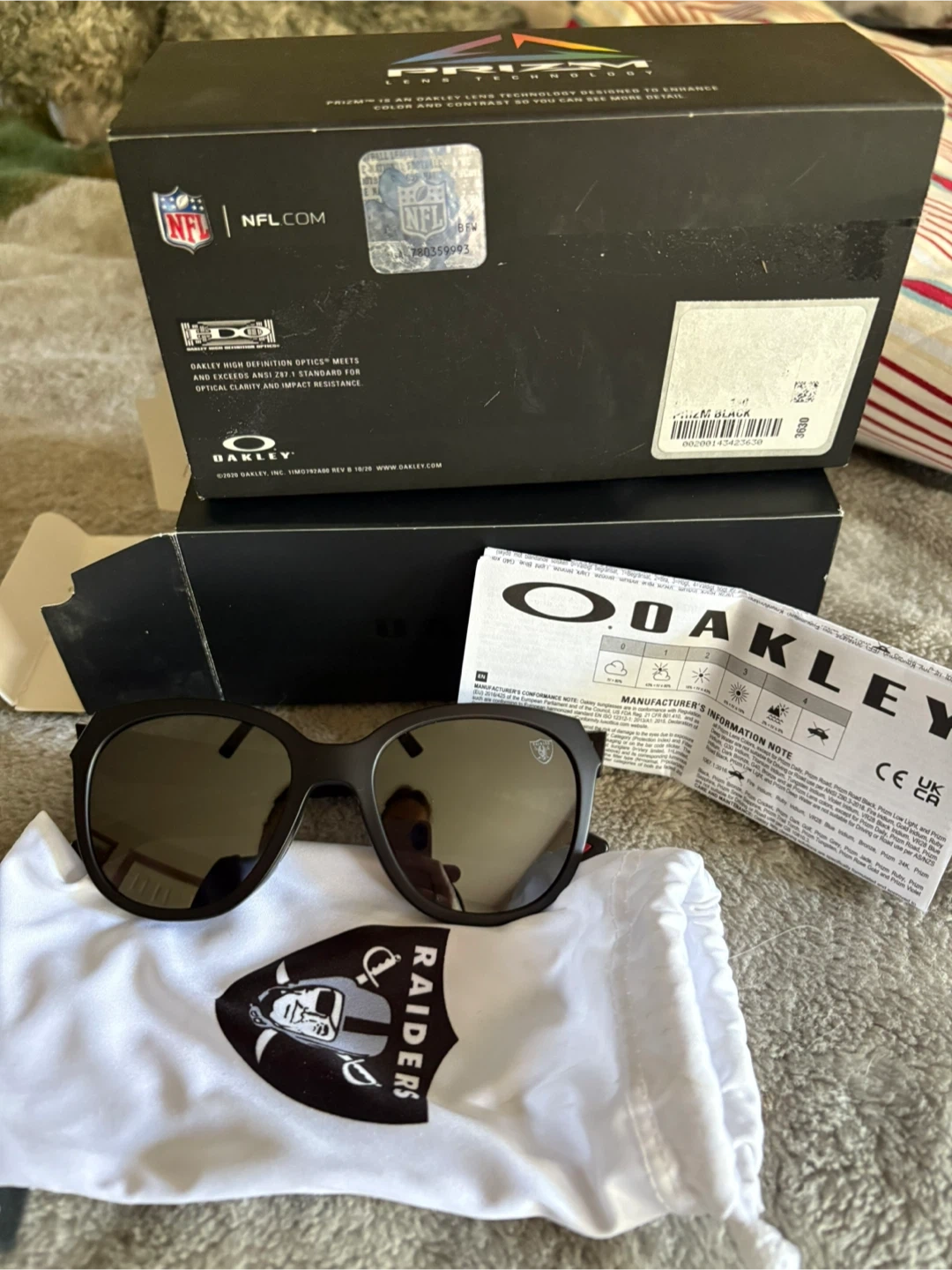 Selling a pair of Oakley sunglasses in black with the Raiders logo. They come with the original box and a soft carrying pouch. The lenses are Prizm, designed to enhance colour and contrast, so you can see more detail. Great for any Raiders fan!