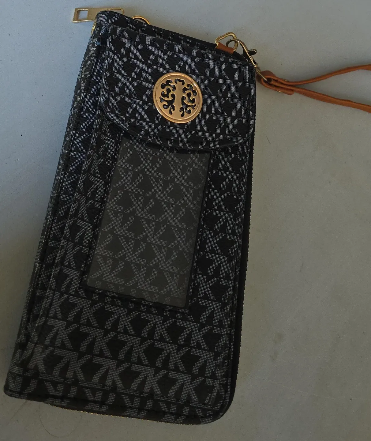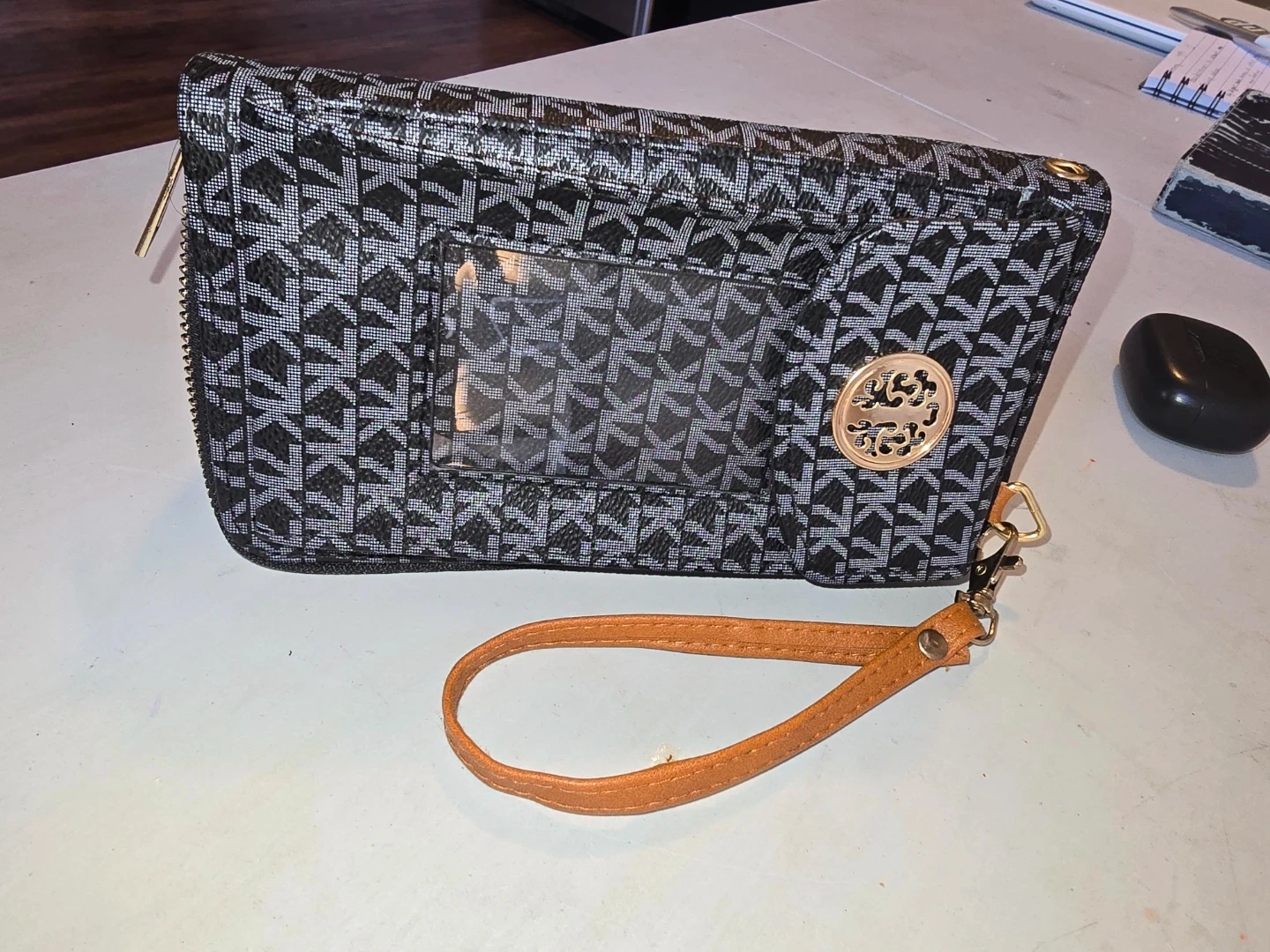 Selling a cute wristlet wallet! It has a stylish black and gray design with a convenient wrist strap it also has a phone case never used. Perfect for keeping your essentials organized on the go.