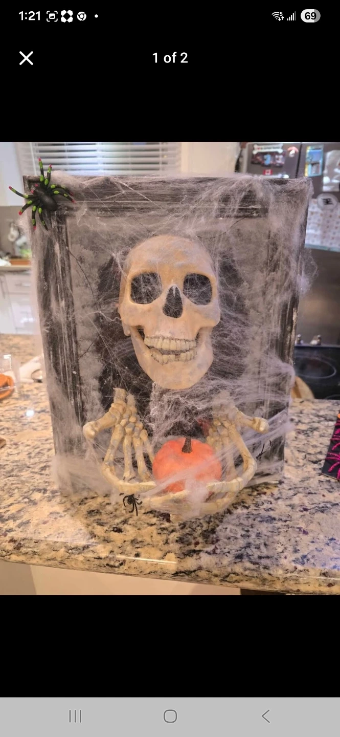 Creepy Halloween decoration featuring a skull with skeleton hands holding a pumpkin. It's surrounded by spooky cobwebs and includes flickering LED lights for an eerie glow. Perfect for setting a haunted scene!