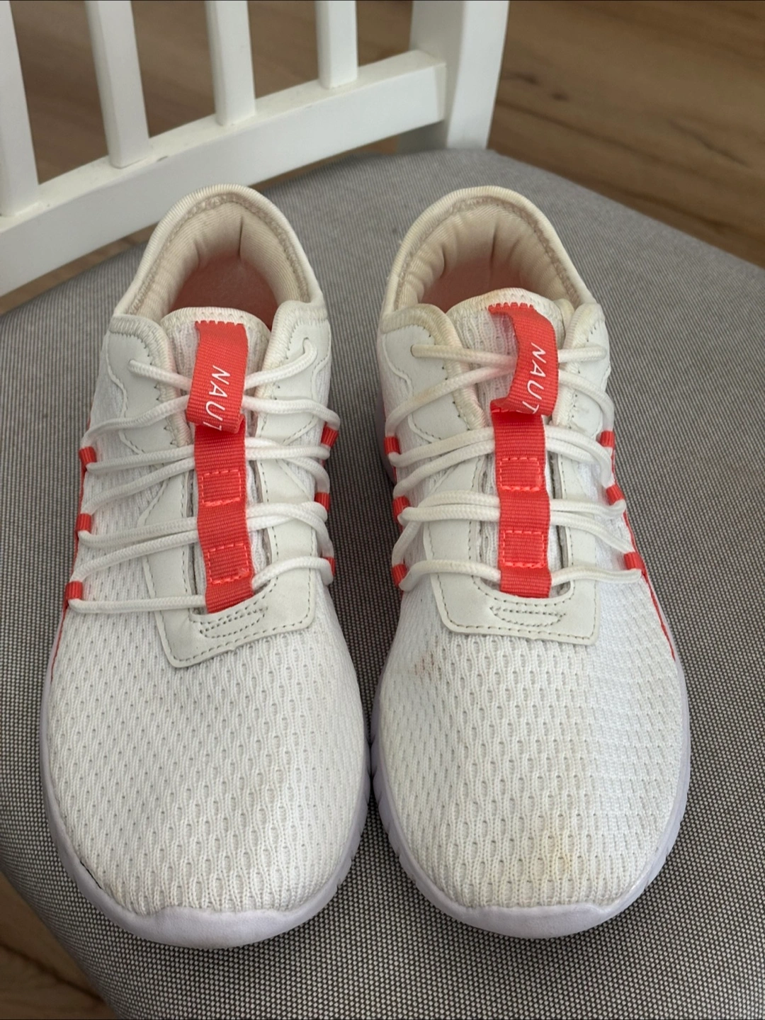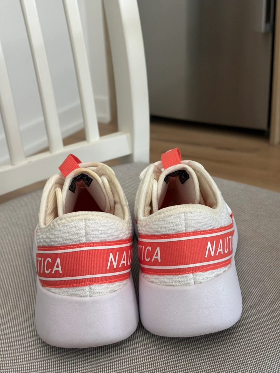 Cute Nautica sneakers in white with coral accents! They're in great shape and ready for a new home. Perfect for everyday wear or light workouts