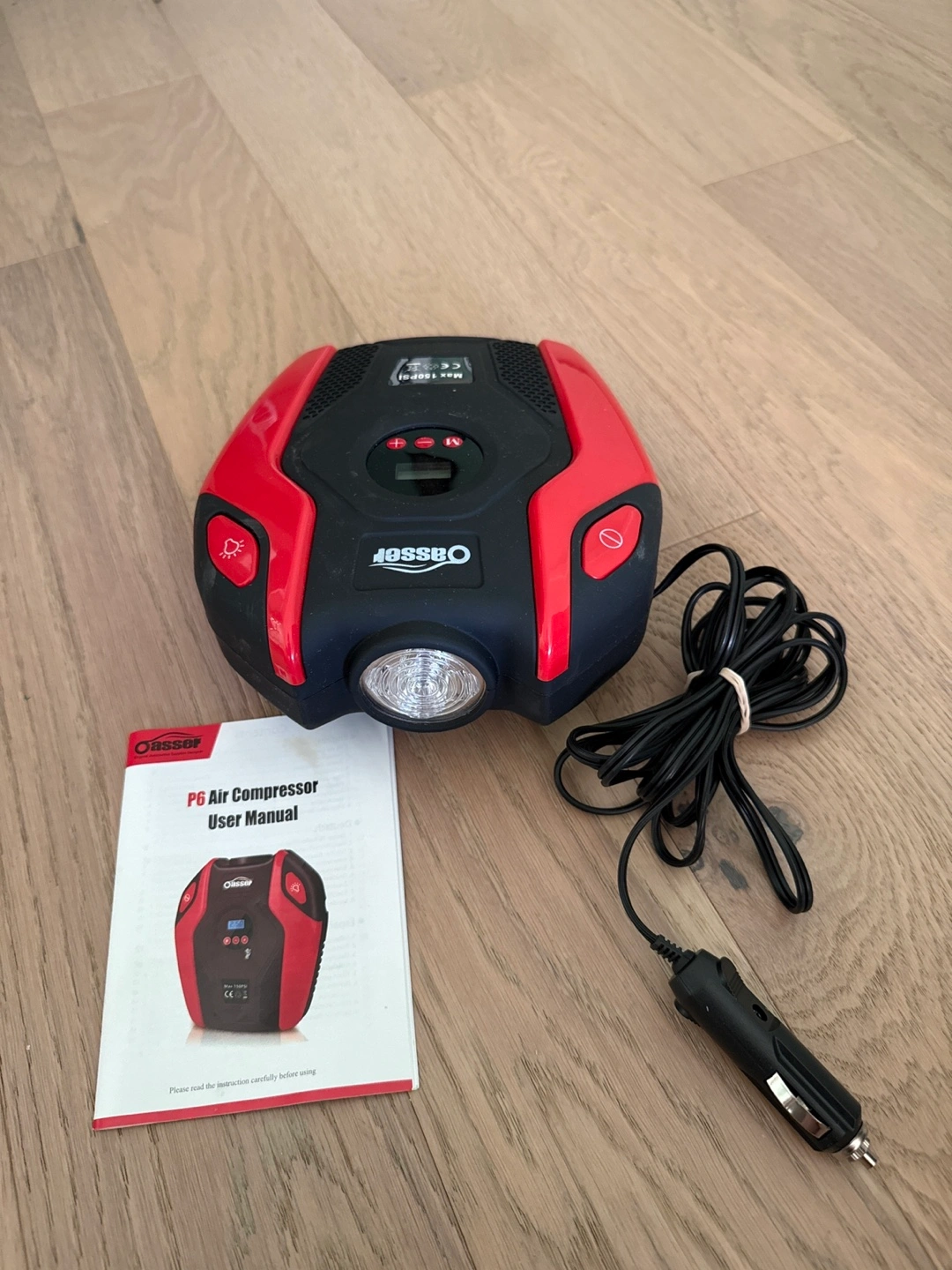 192A black and red air compressor. Comes with a user manual. The device has a digital display and a cable with a car adapter. You will find this item quite useful, especially in urgent situations.