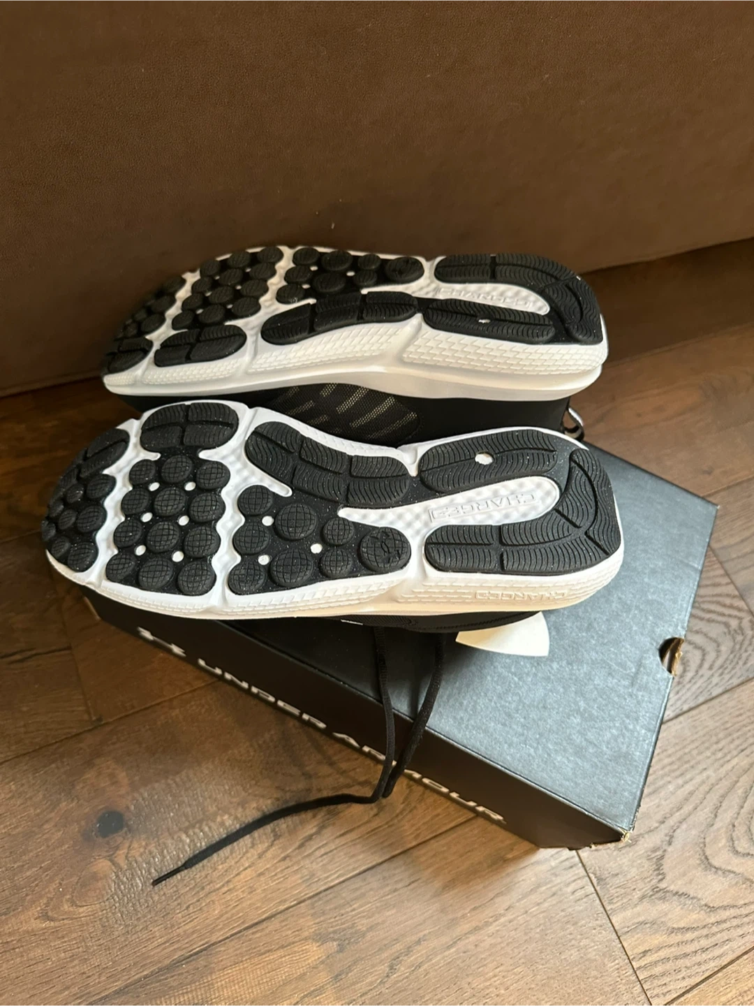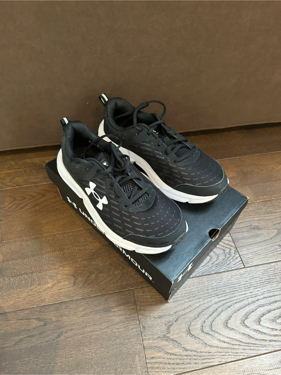 Under Armour Charged Assert 10 running shoes in black and white. Men's size 9, extra wide fit. These shoes come with their original box. They're designed for comfort and support during runs.