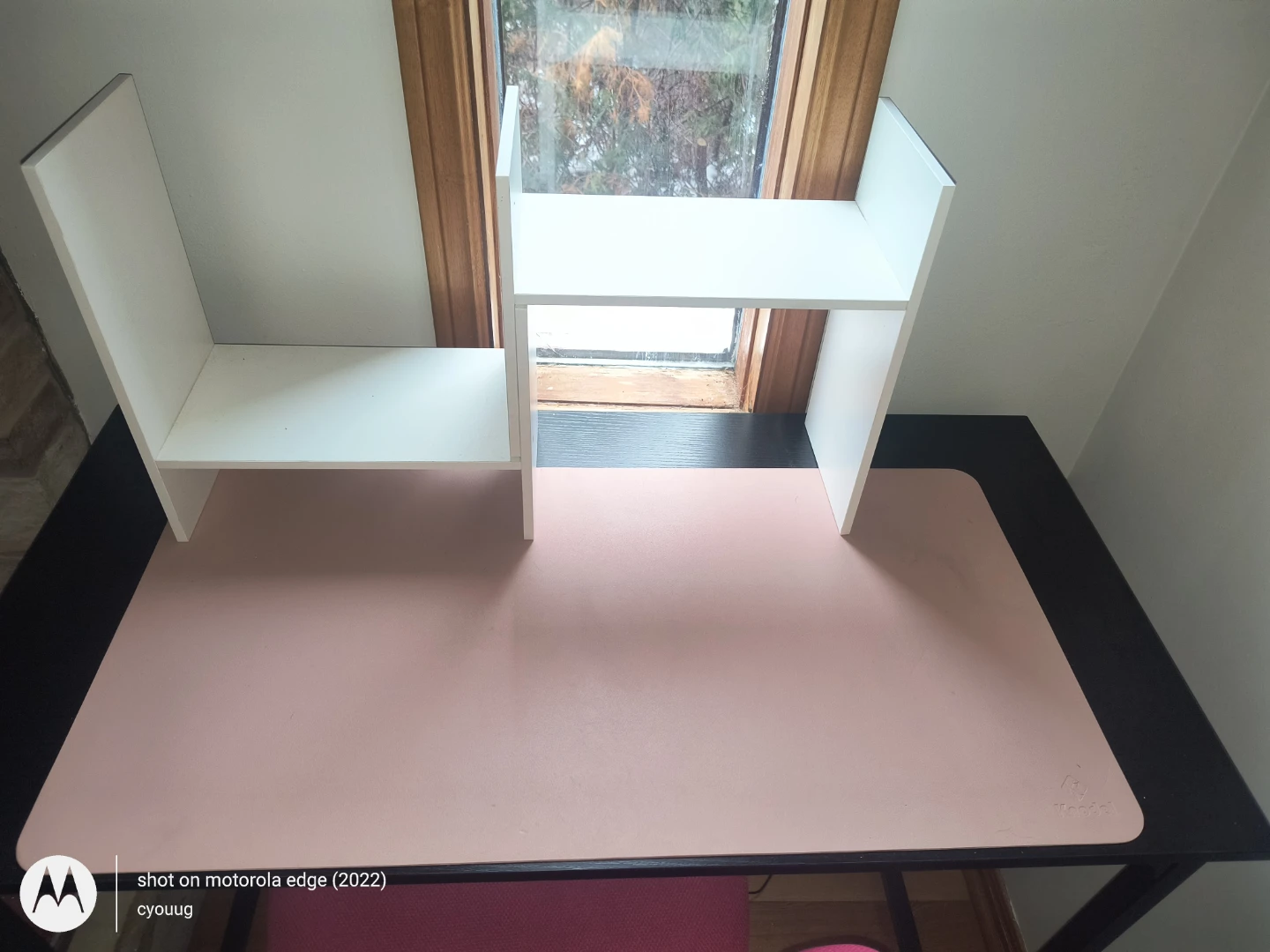 This desk setup includes a pink desk mat and a white organizer stand. The mat is made of durable material that protects your desk surface. It's great for organizing your workspace and keeping your desk tidy!