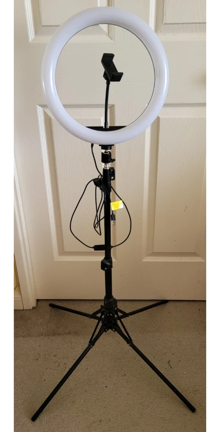 This is a ring light with a tripod stand and a phone holder. It's perfect for content creators or anyone who needs good lighting. The stand is adjustable, and it comes with a USB-powered light.Stand folds up for storage.