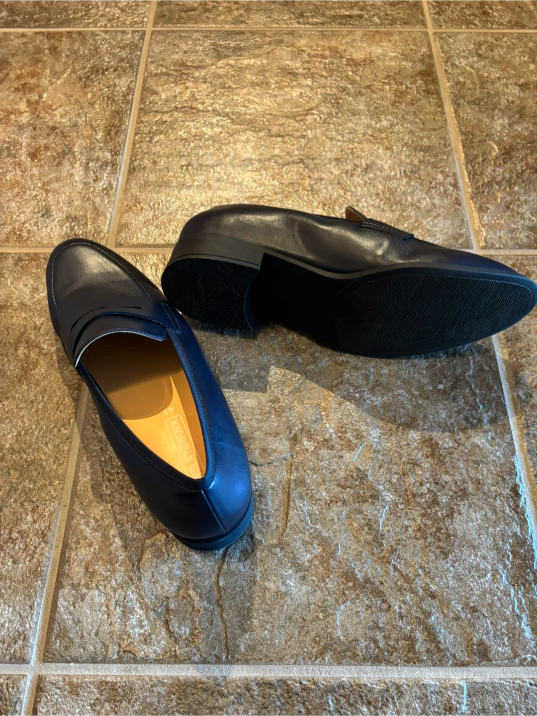 Classic navy blue loafers by Wolky@work. These brand new shoes are made of real leather with a comfortable interior lining. They feature a traditional penny loafer design with a low heel.