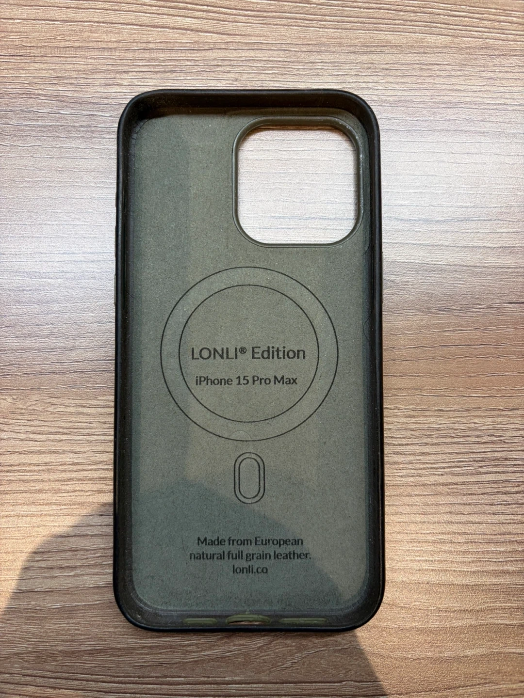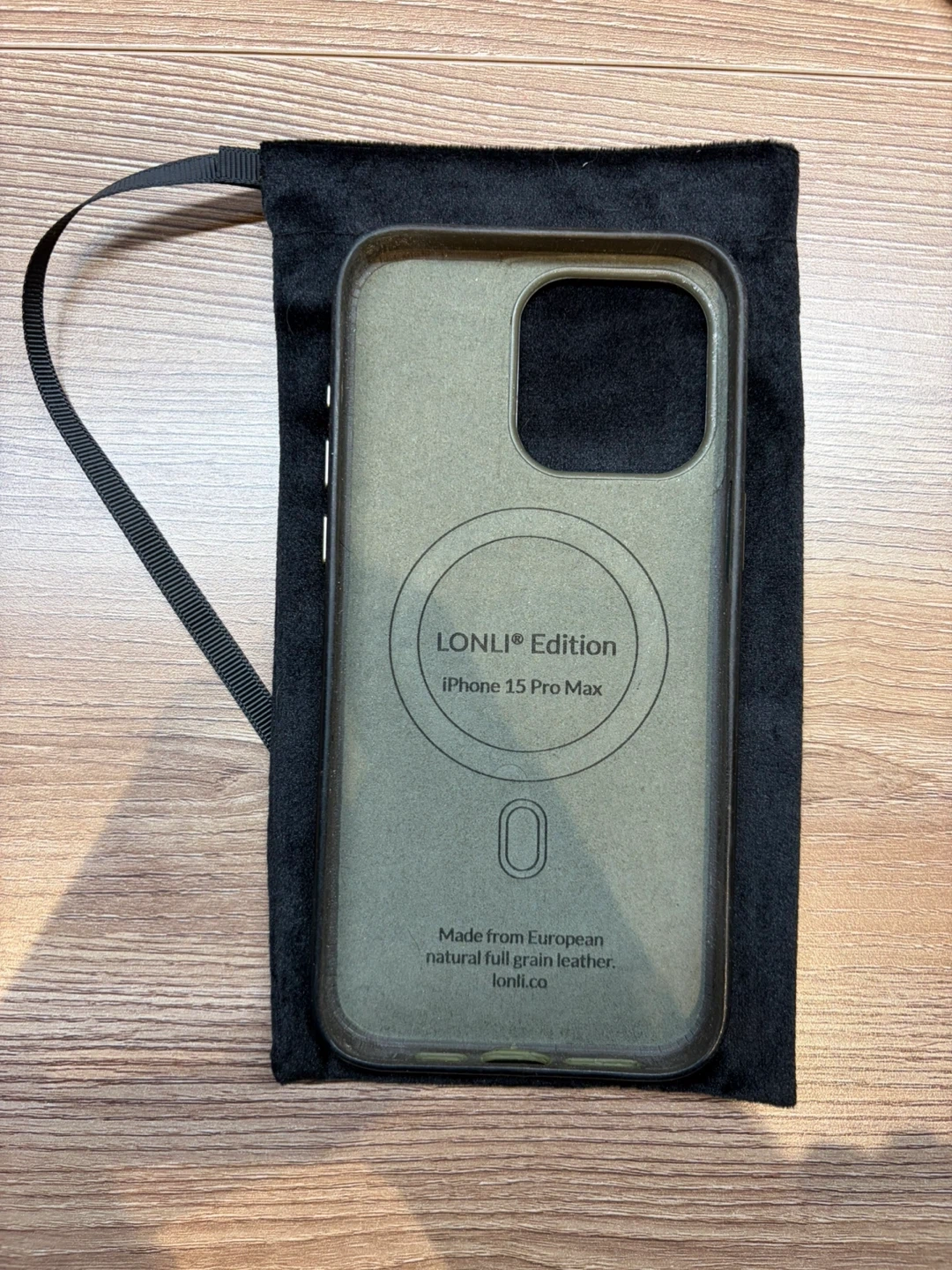 LONLI Edition case for iPhone 15 Pro Max. Made from European natural full grain leather. Comes with a protective pouch.