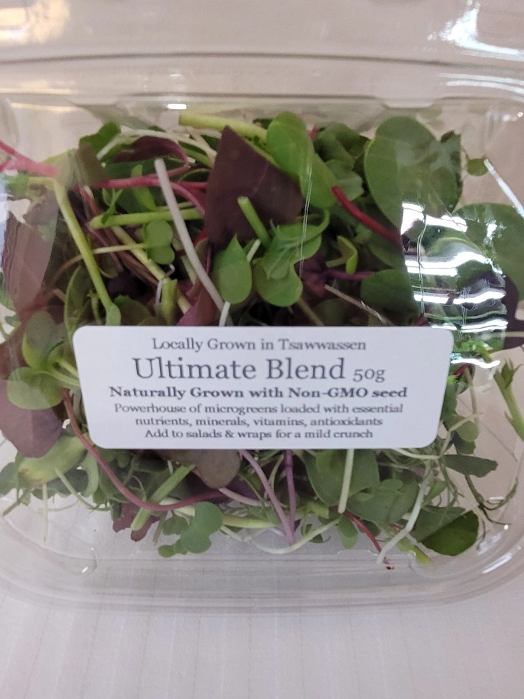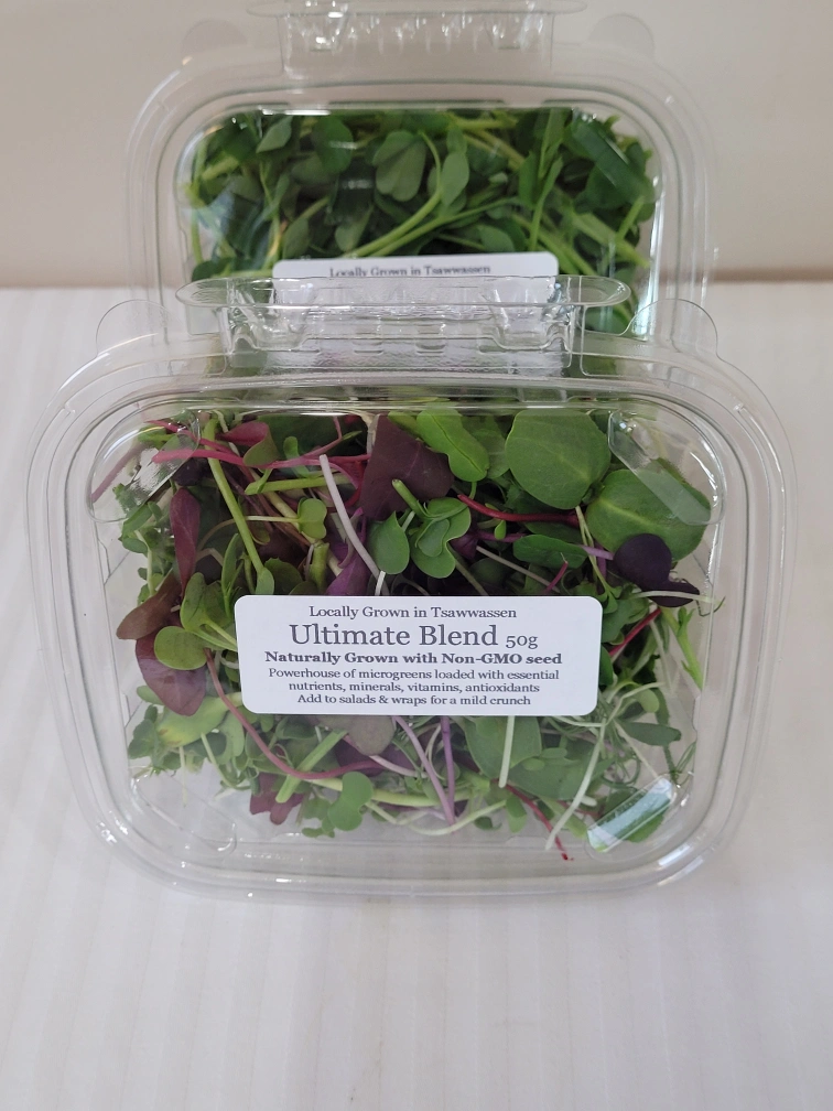 Two containers of microgreens. One container pea shoots, one ultimate blend. 50g each. Grown in Tsawwassen. Naturally grown with non-GMO seed. Add to salads, soups, wraps, stir-fry, smoothies.