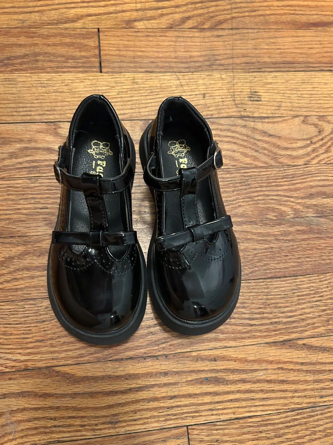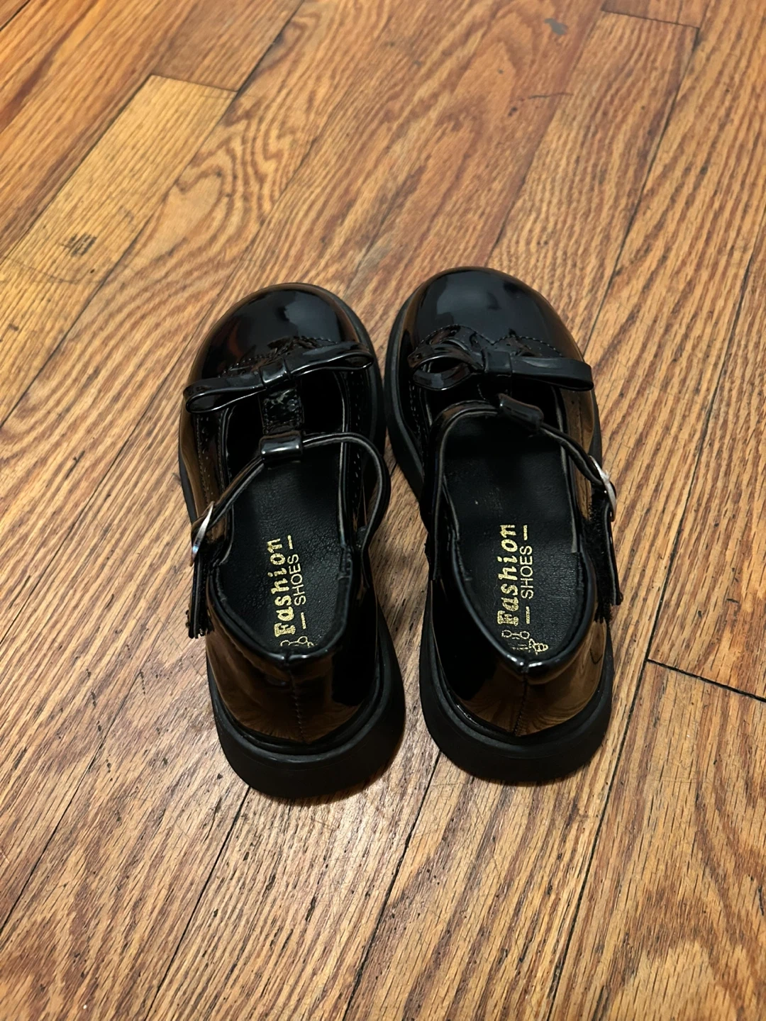 Classic black patent Mary Jane shoes for kids. Features a T-strap with a buckle closure and decorative bow. These fashion shoes are shiny and durable for young kids. The size is 13 in Kids