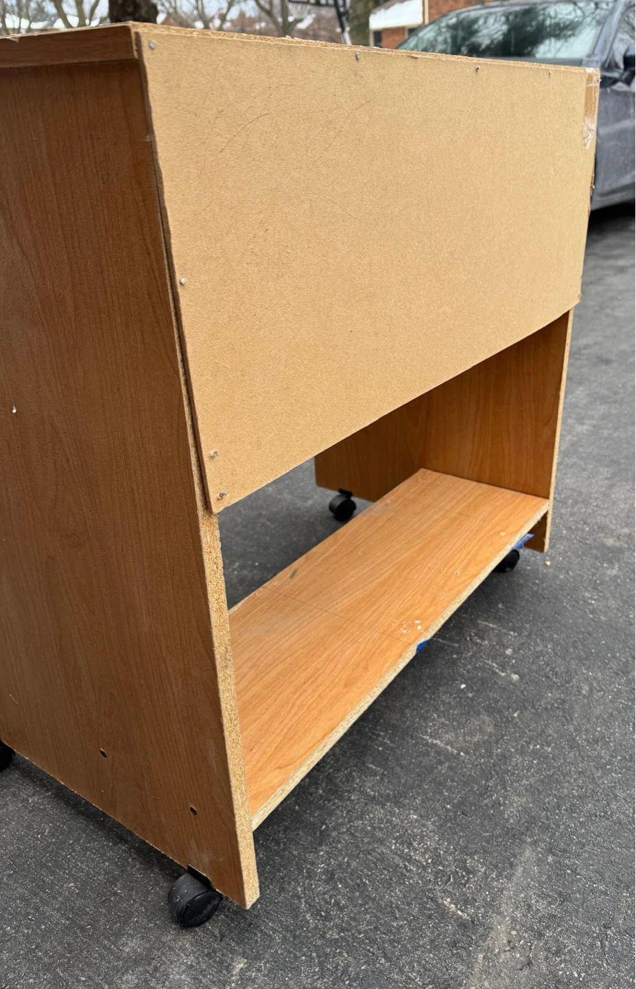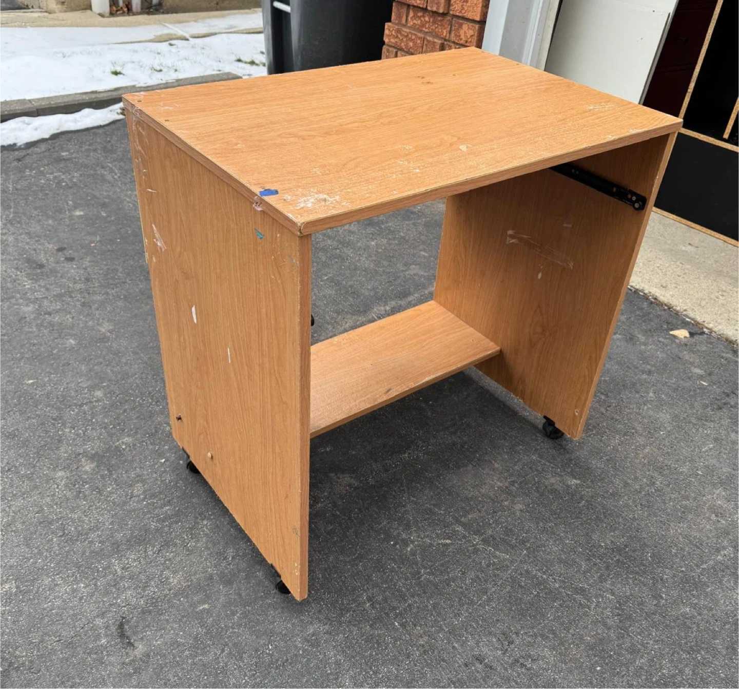 Selling a small wooden desk, perfect for a compact workspace! It is easy to move around with its wheels. It's in good condition and ready for a new home office setup
