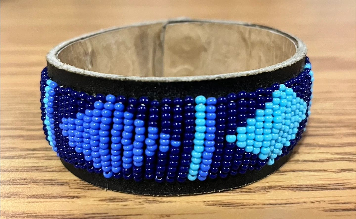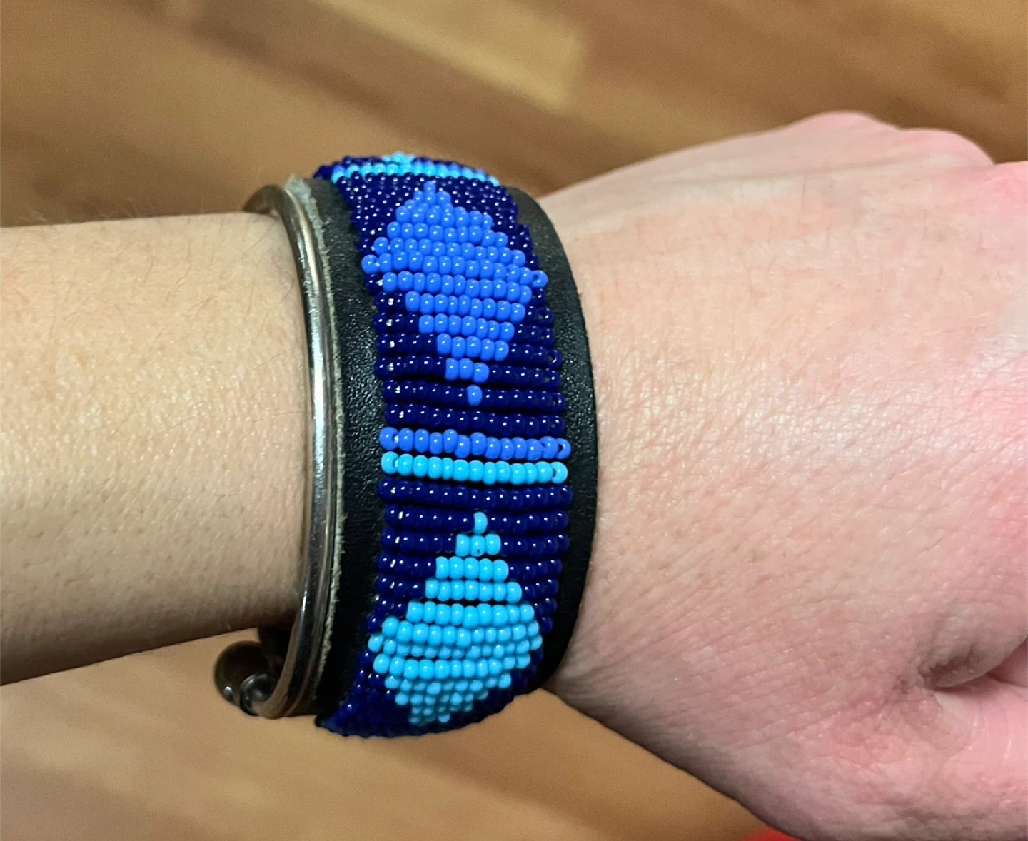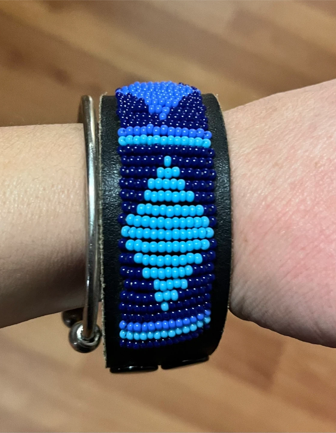 Add a pop of colour to your wrist with this eye-catching, used beaded bracelet, showcasing a unique blue geometric design. The bracelet is previously owned.