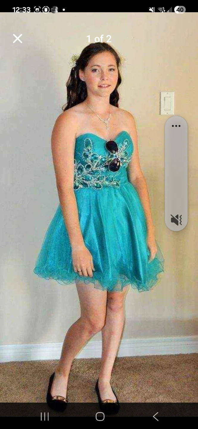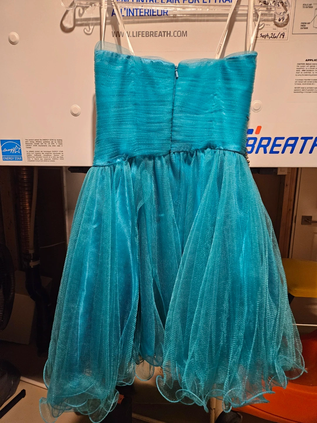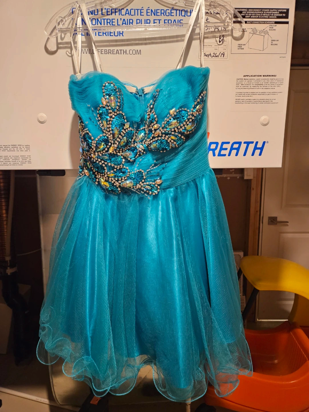 This Hannah S strapless dress is a vibrant teal colour. It features a sequined and beaded bodice. Tulle overlay skirt with a fun, flirty hem. Perfect for a special occasion or party!