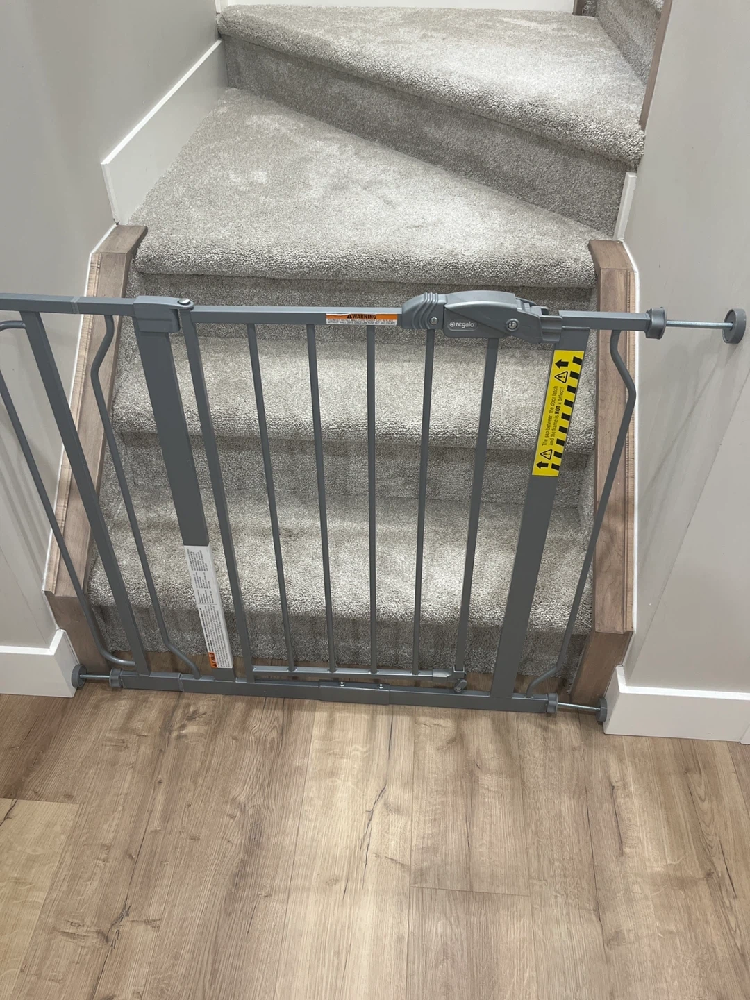 Regalo metal baby gate in grey. It's a pressure-mounted design, suitable for doorways and stairways. Easy to install and operate.