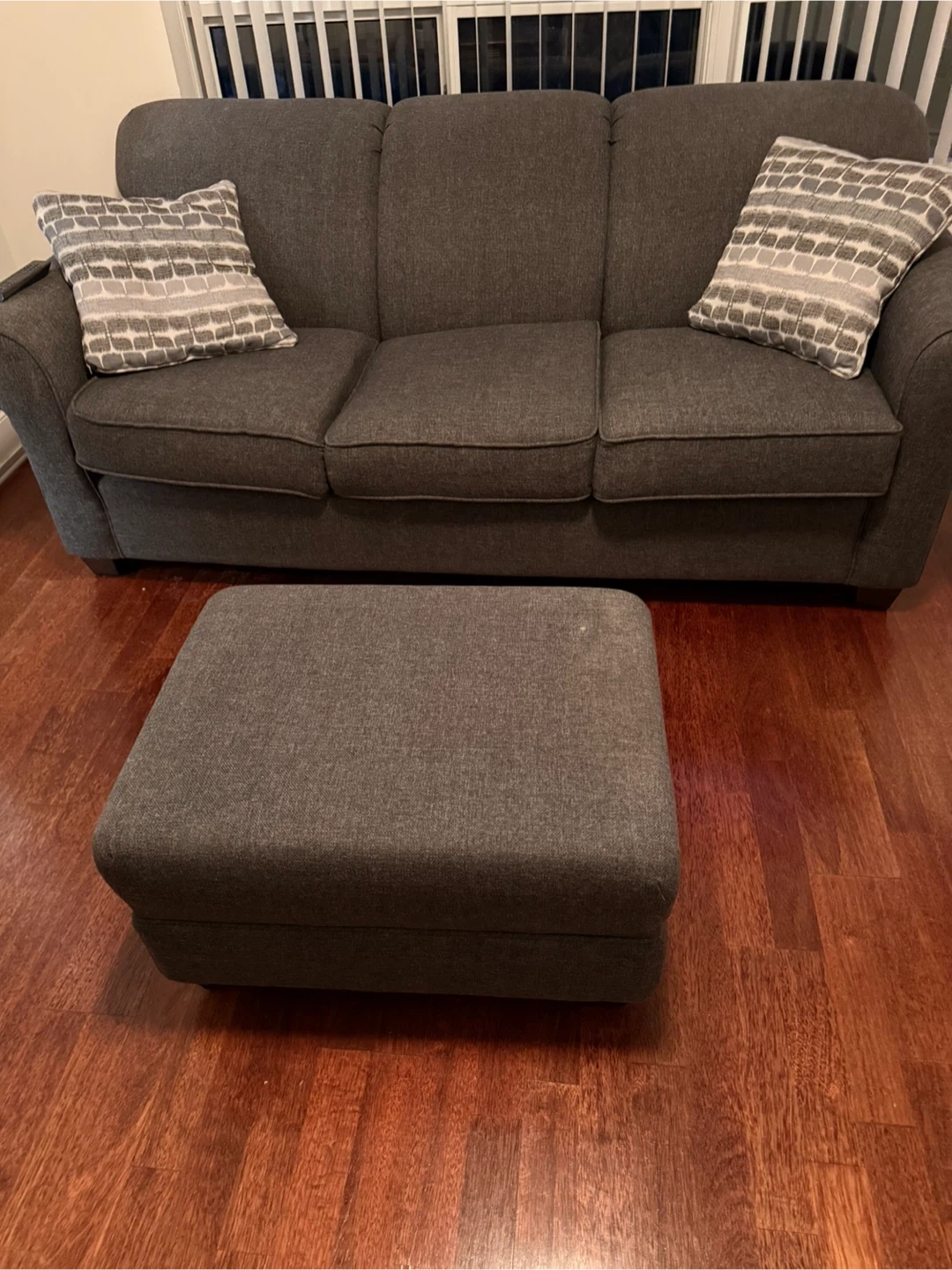 Dark grey fabric sofa with three seat cushions and matching ottoman. Includes two decorative throw pillows. Good condition!