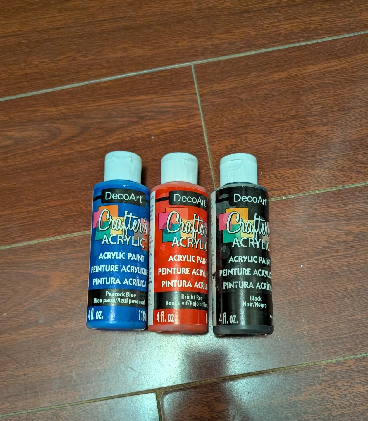 Set of three DecoArt Crafter's Acrylic Paints. Includes Peacock Blue, Bright Red, and Black colours. Each bottle is 4 fl. oz. Great for various craft projects!