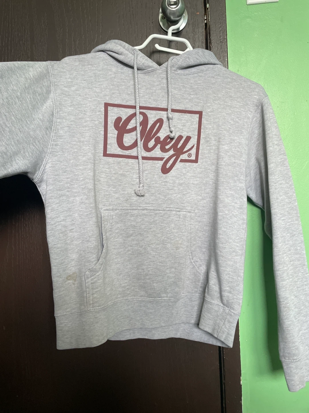 10Selling a grey Obey hoodie. It has a red Obey logo on the front. There's a small stain beside the front pocket. Barely noticeable. Comfortable fit.