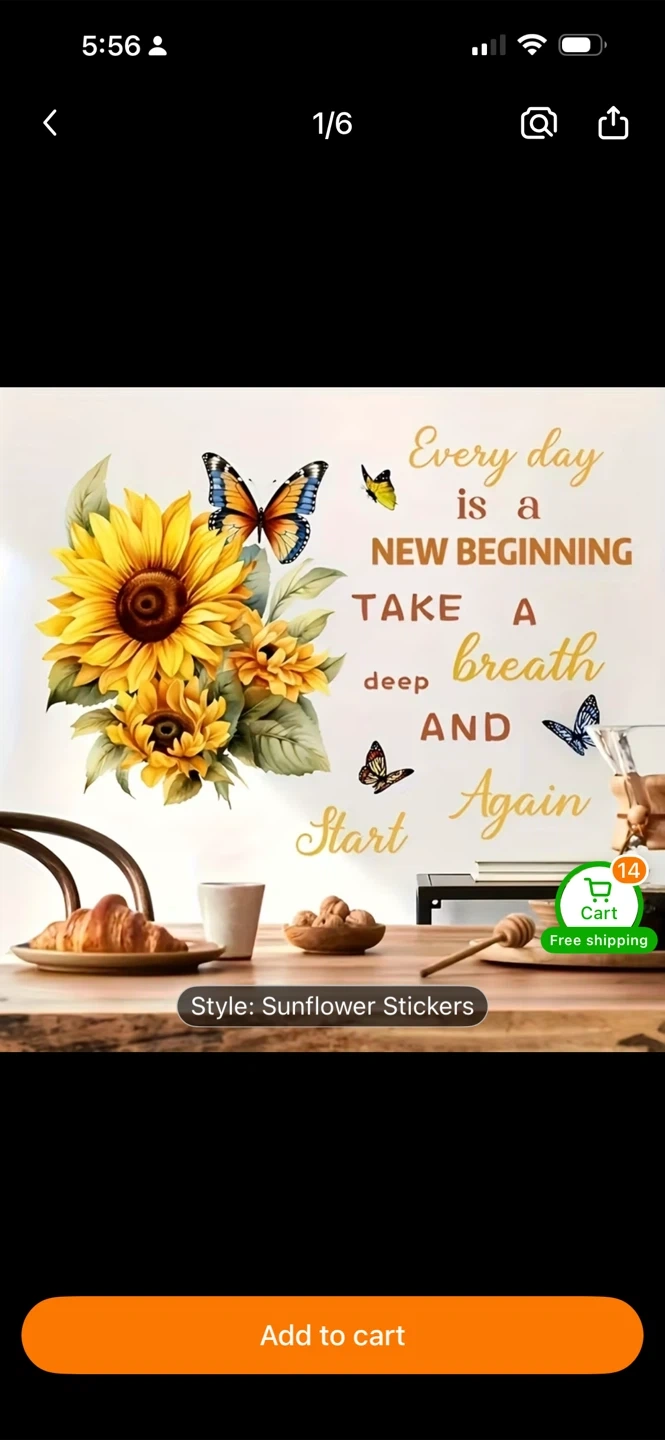 These decorative stickers feature sunflowers and butterflies with an inspirational quote. "Every day is a new beginning, take a deep breath and start again.". Easy to apply to walls for a cheerful accent. Comes with two sheets of stickers.