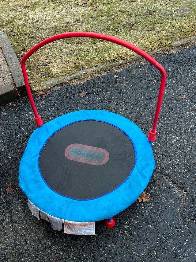 Get ready to bounce with this Little Tikes trampoline, perfect for toddlers and young children to burn off some energy indoors or outdoors! This trampoline has seen some action. It's in used condition, but still offers plenty of fun and safe bouncing. The safety bar provides extra stability for little ones as they jump. Brand: Little Tikes. Weight Limit: Up to 55 lbs. Recommended Age: 3-6 years. Cash accepted.