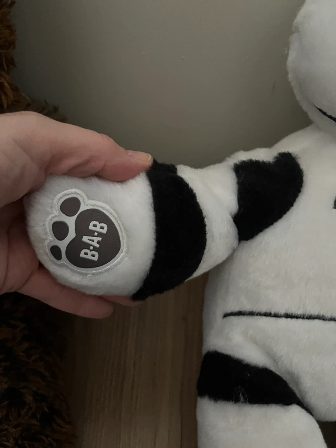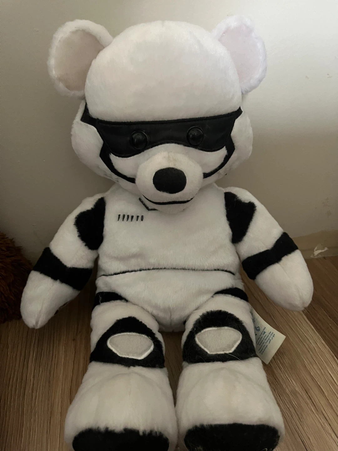 This is a Build-A-Bear teddy bear dressed as a Stormtrooper. It has the signature black and white design of a Stormtrooper. Perfect for Star Wars fans! The sound in the paw does not work.