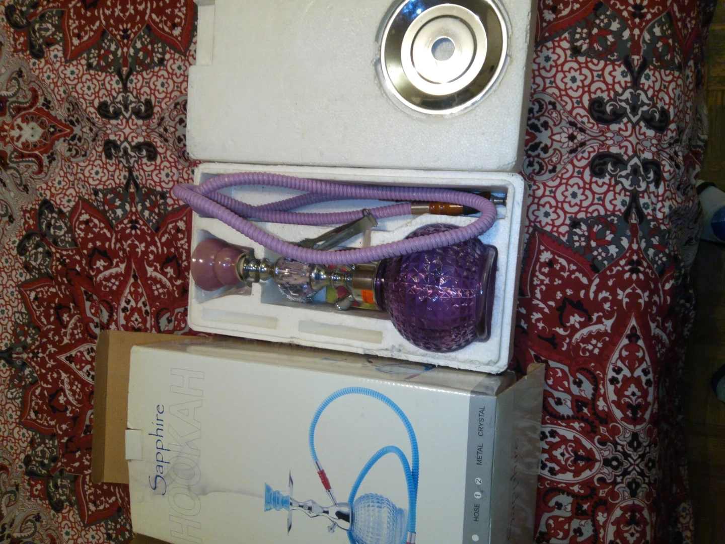 This is a Sapphire Hookah set that comes with a purple glass base and a purple hose. It includes the hose and stem components. It's ready for use!
