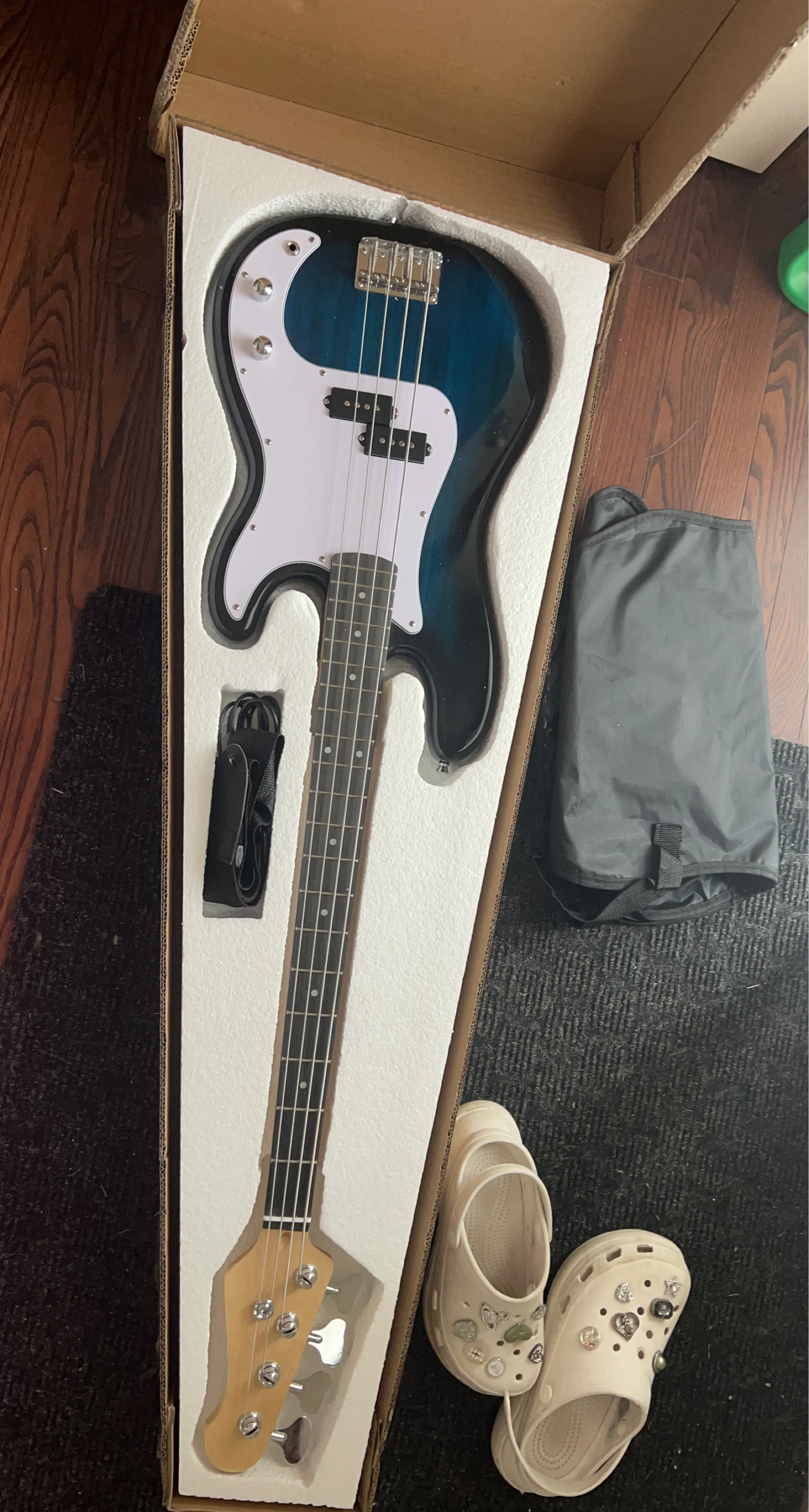 This electric bass guitar is a vibrant blue with a white pickguard. It includes a gig bag and charging cable. It's a standard 4-string model. This bass is great for beginners looking to learn. Used only like twice and E transfer accpected too ‼️need gone ASAP‼️ Lowest price i can take is $120!!