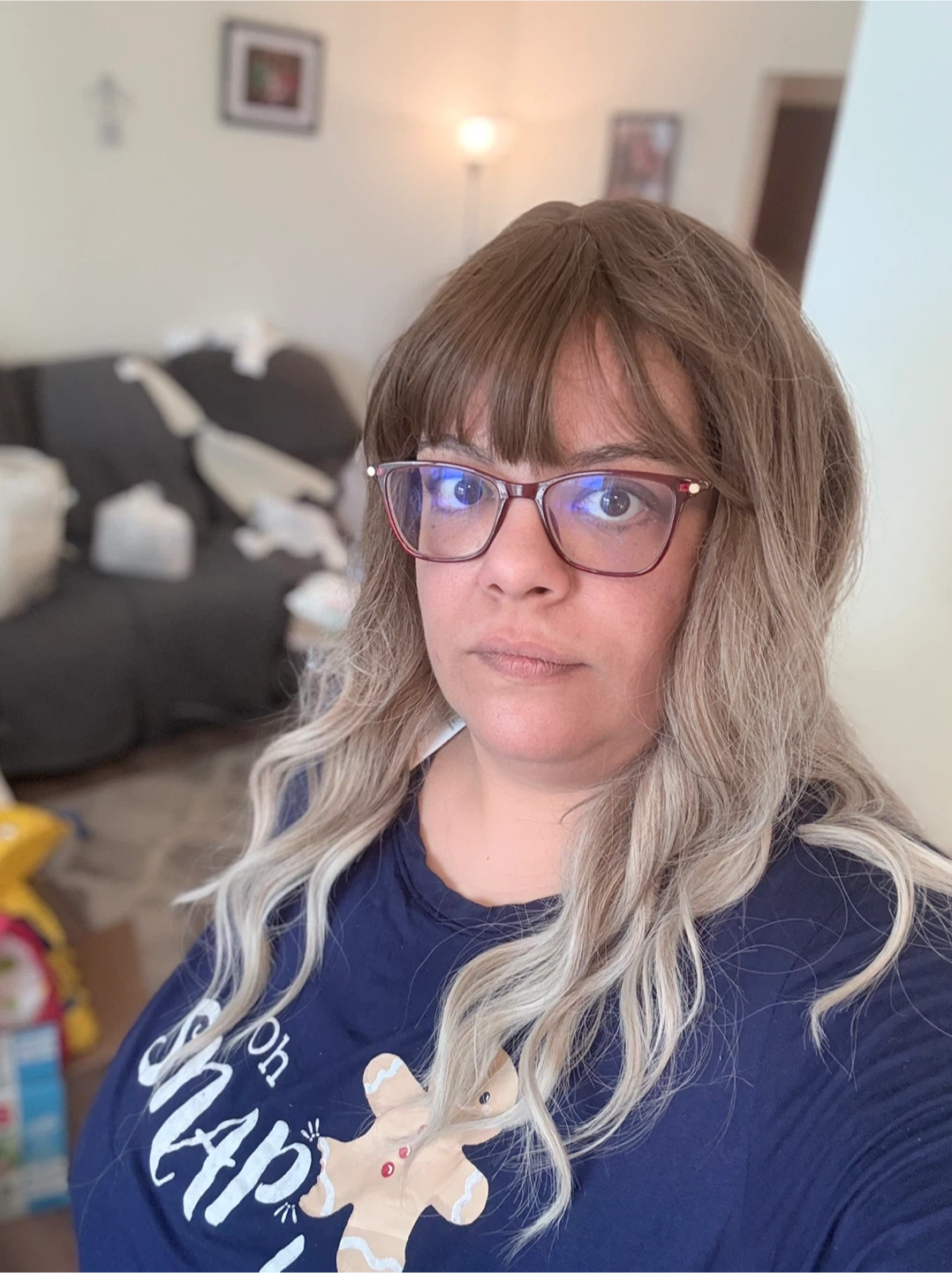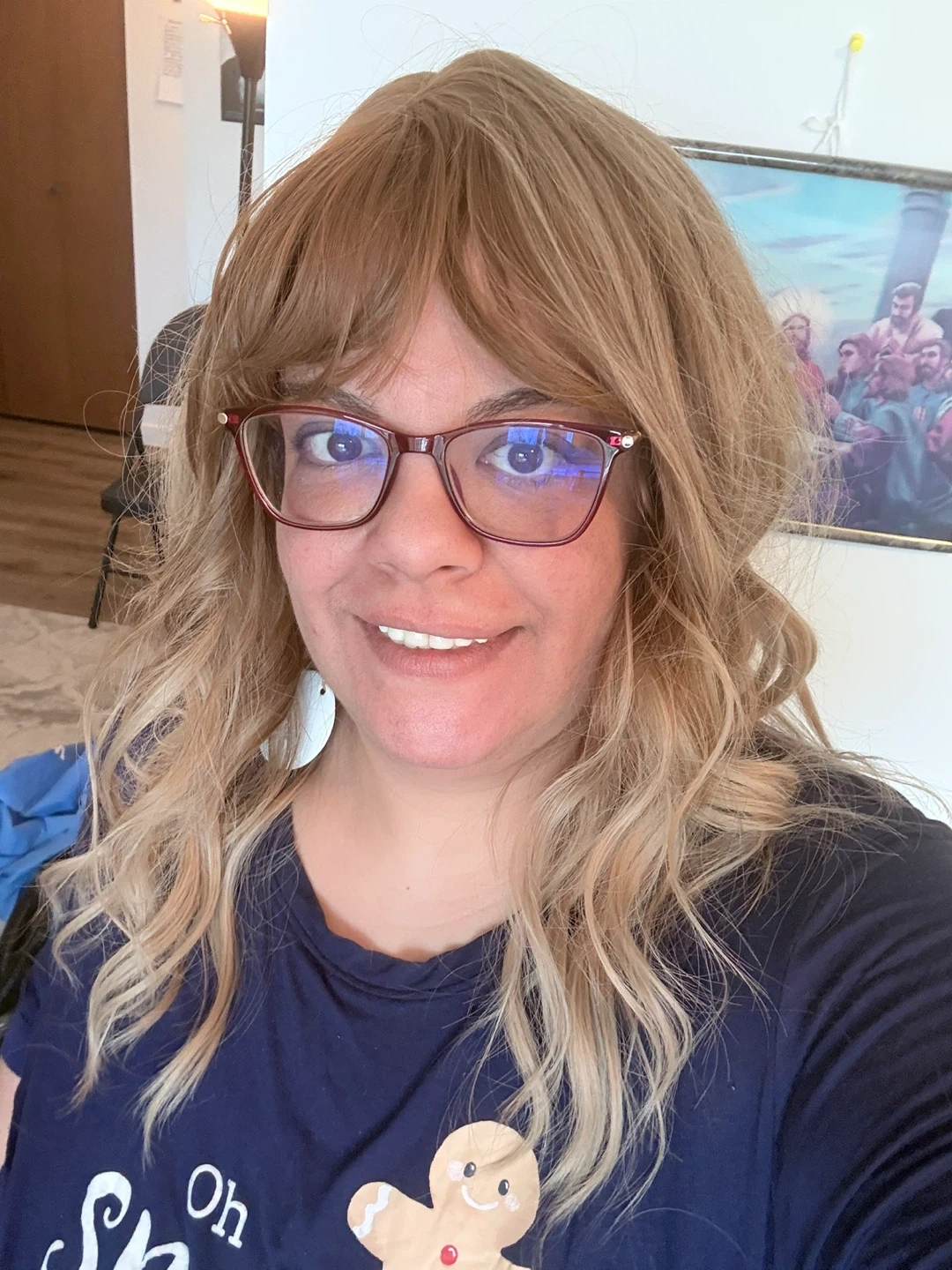 This is a shoulder-length, wavy brown wig with bangs. It has a natural look and feel, perfect for everyday wear or special occasions. The adjustable cap ensures a comfortable and secure fit.