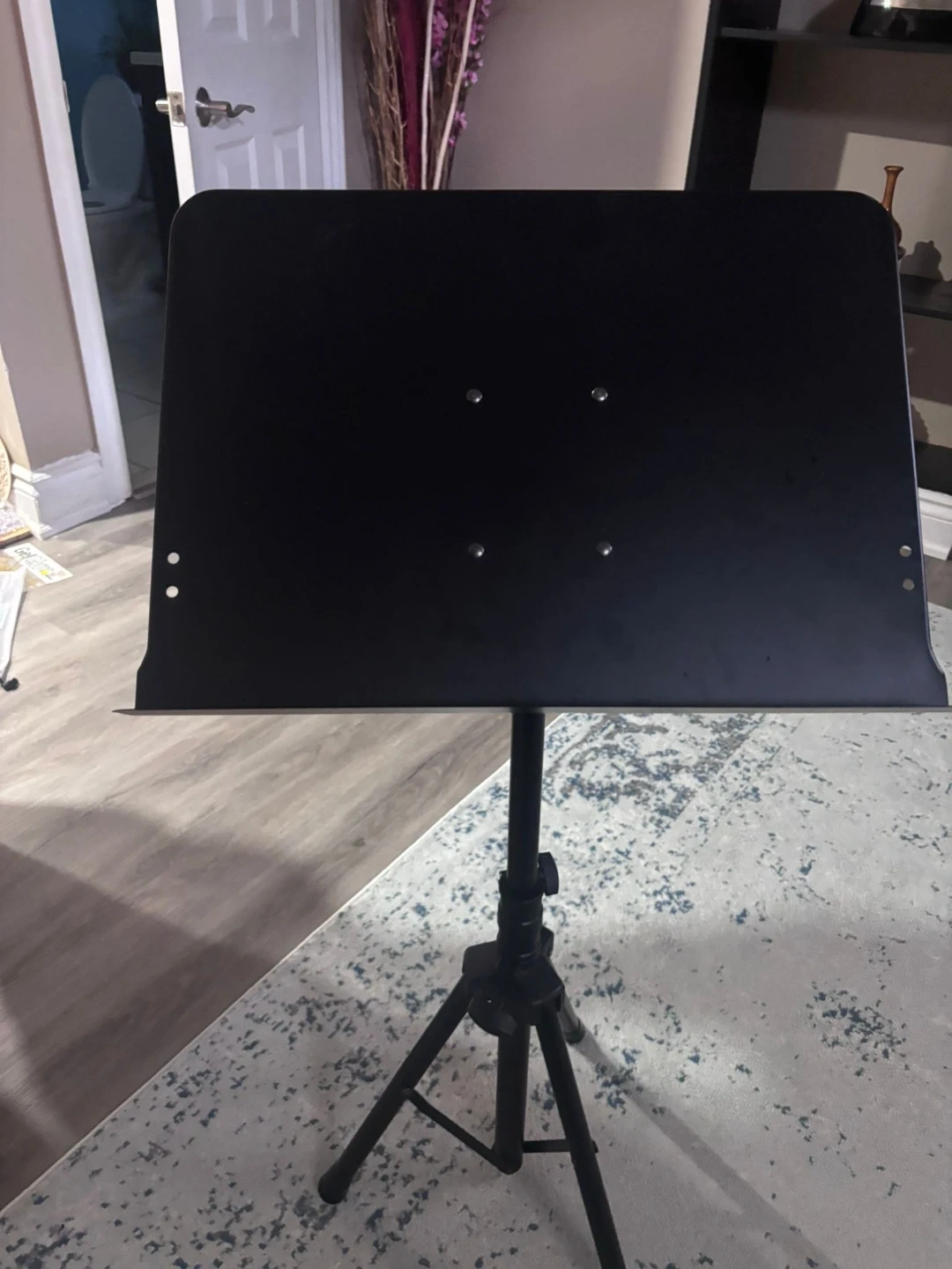 This is a black, folding music stand. It features a sturdy metal construction with a tripod base for stability. The stand is adjustable in height and angle for optimal viewing.