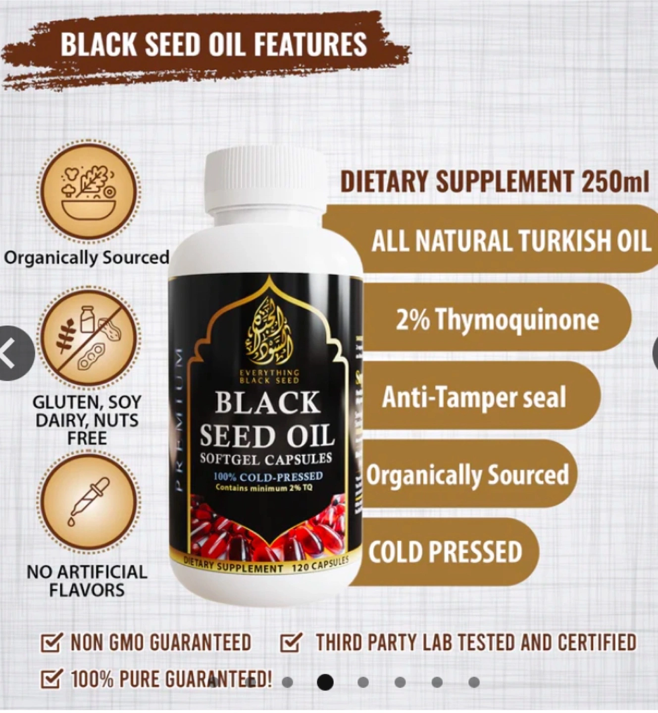 I am selling a premium quality brand new bottle of Everything Black Seed Oil, containing 120 softgel capsules, each with 1000mg of 100% cold-pressed black seed oil, ensuring a potent dose with a minimum of 2% TQ (Thymoquinone) for optimal health benefits. These capsules are perfect for anyone looking to add a natural supplement to their daily routine.