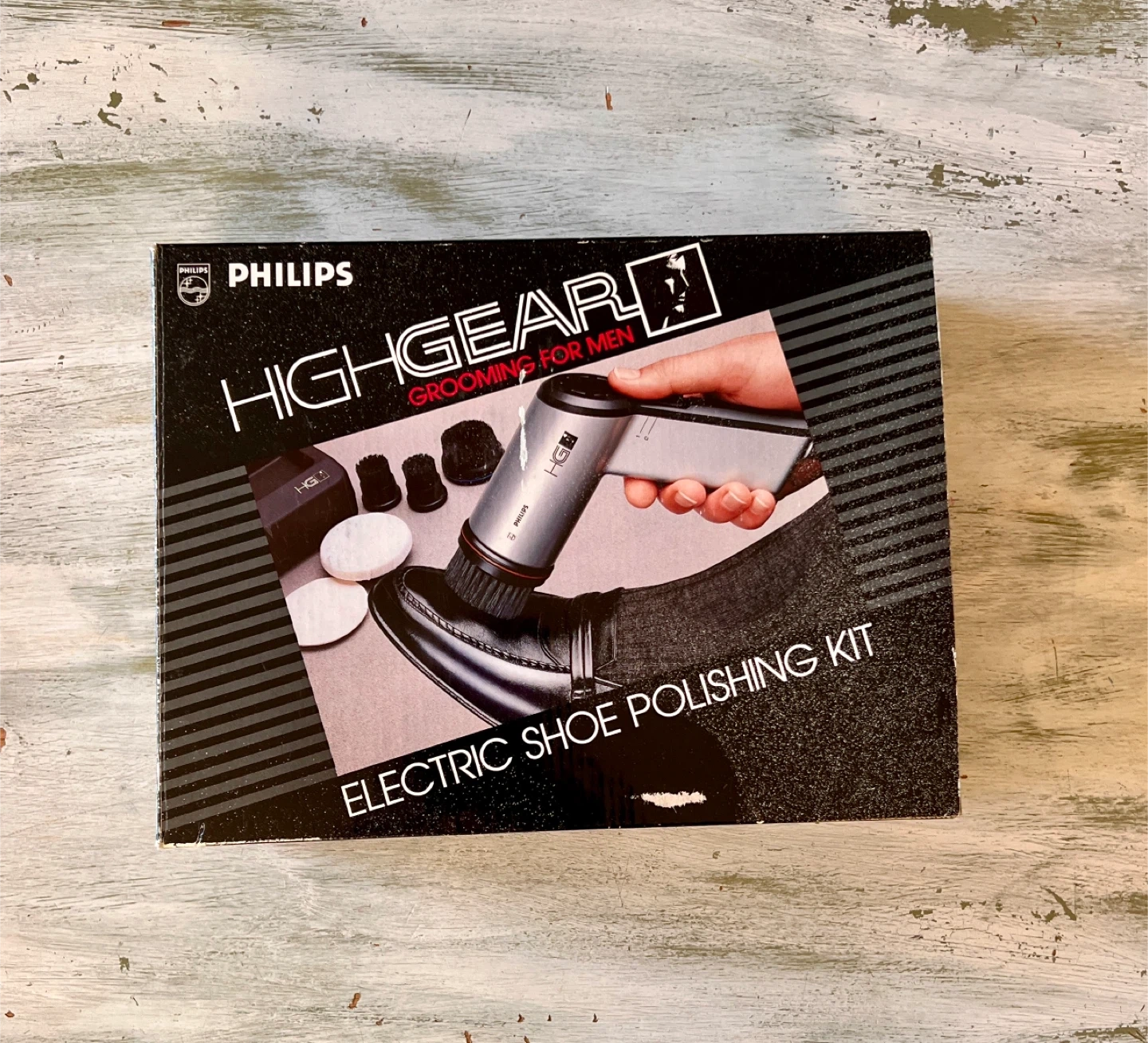 This is a Philips HighGear electric shoe polishing kit. It includes the electric polisher, several brushes, and polishing pads. Comes with original box and manual. Great for keeping your dress shoes looking sharp!