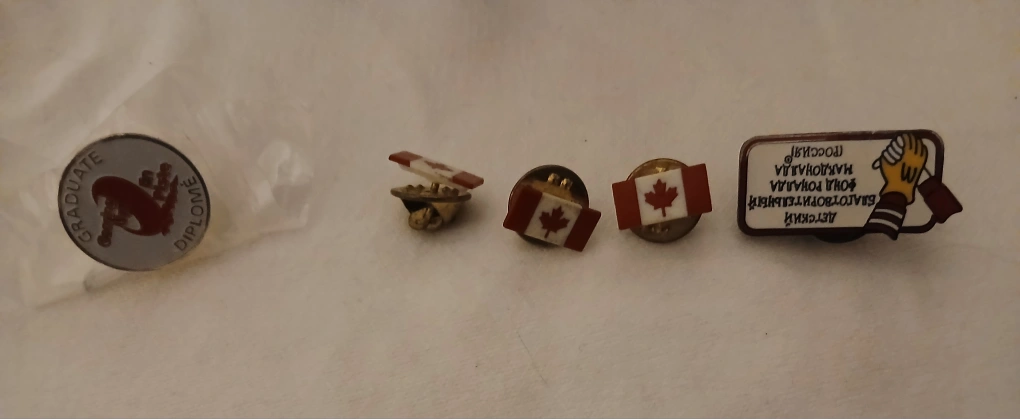 This collection of vintage lapel pins includes three Canadian flag pins and a pin from the Ronald McDonald House Charities in Russia featuring a stylized hand and the text "ДЕТСКИЙ БЛАГОТВОРИТЕЛЬНЫЙ ФОНД РОНАЛДА МАКДОНАЛДА (РОССИЯ)",,.