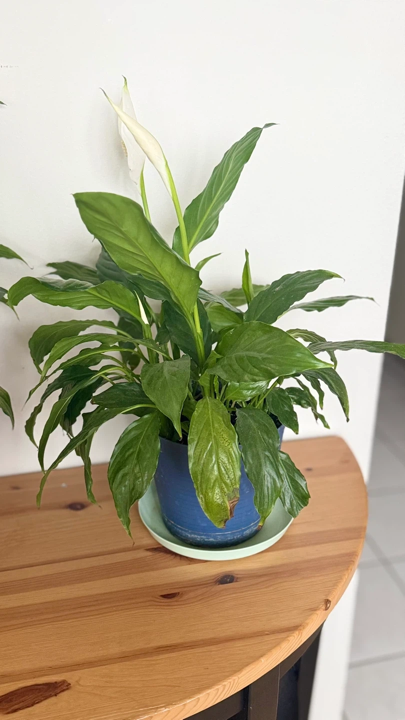 A healthy Peace Lily plant with white blooms in a blue pot with a light green saucer. It's a classic houseplant known for its air-purifying qualities. This plant would brighten up any living space!