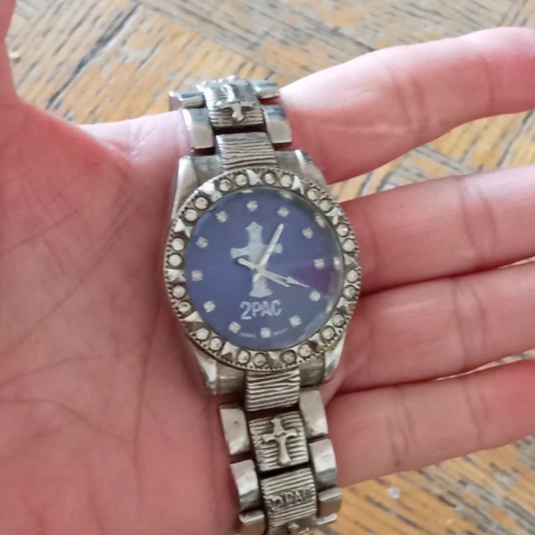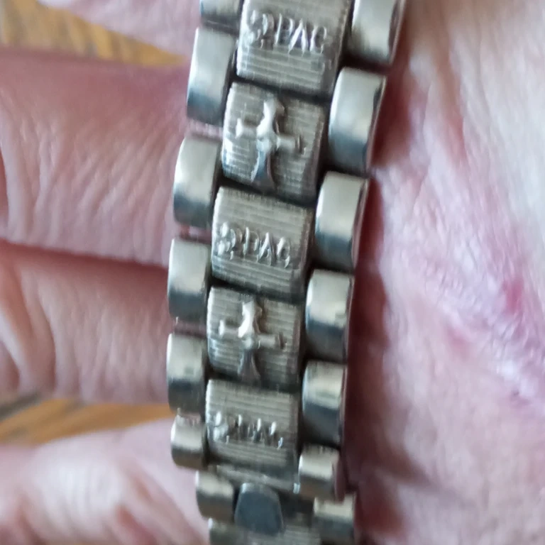 The band is silver-toned metal with "2PAC" and cross emblems