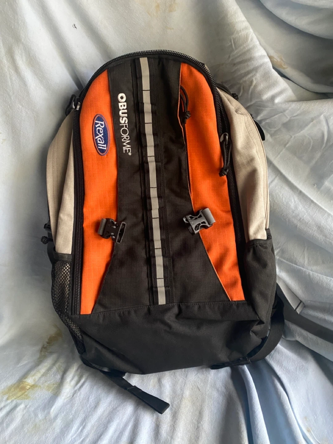 Selling an ObusForme Rexall backpack in orange and black. It features a comfort support system. The backpack is in new condition and ready for a new adventure! Pick up Oro Medonte cash $35