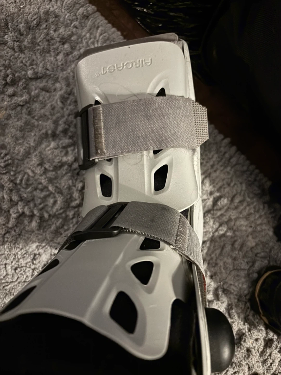 This is an Aircast walking boot, designed for ankle and foot support. It features adjustable straps for a secure fit. This boot is useful for recovery from injuries. It's made of durable plastic and nylon materials.