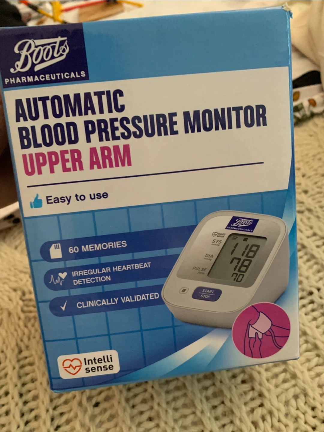 Boots Pharmaceuticals automatic blood pressure monitor for upper arm use. It features 60 memories and irregular heartbeat detection. Clinically validated for accurate readings.