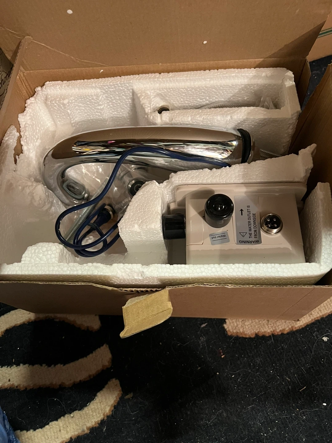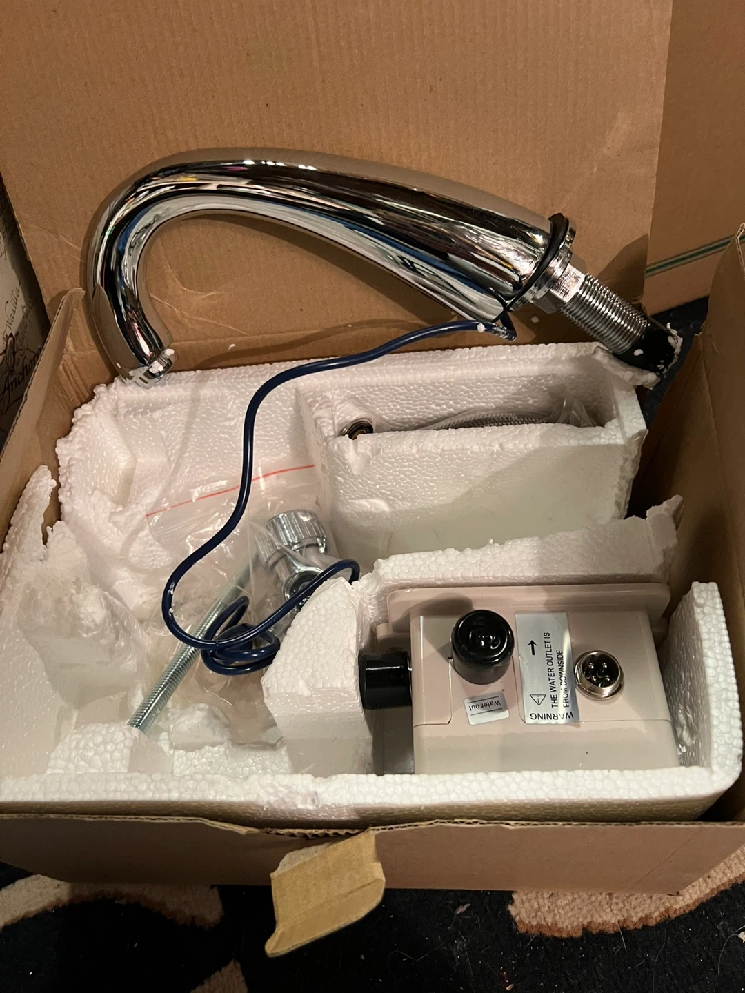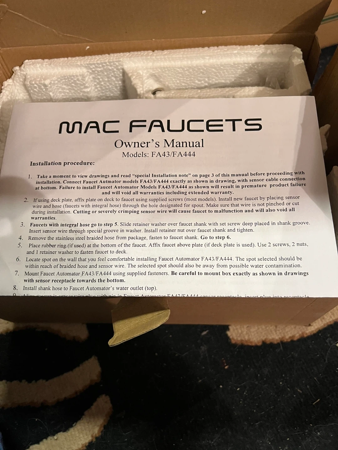 MAC FAUCETS automatic faucet set. Model FA43/FA444. Includes faucet, control box, and mounting hardware. Chrome finish.