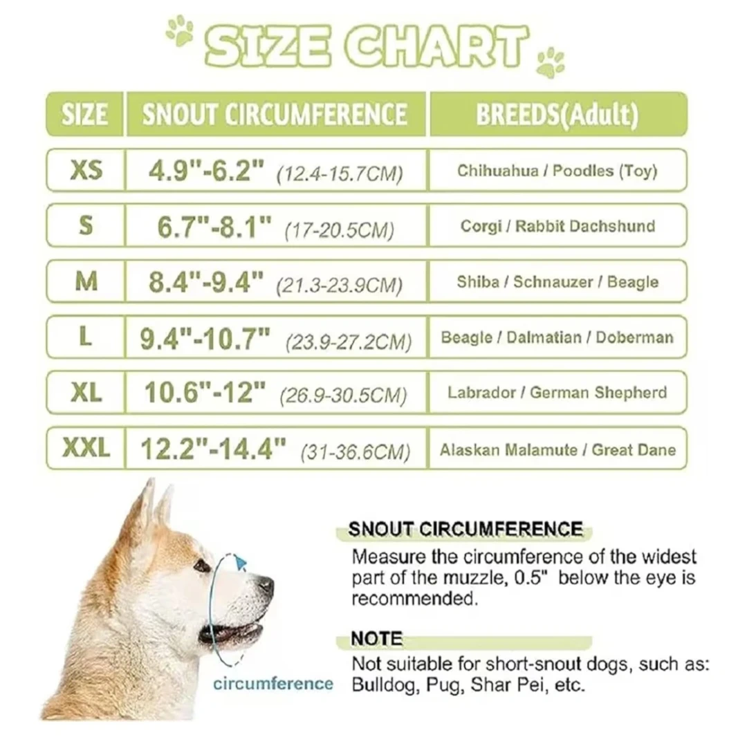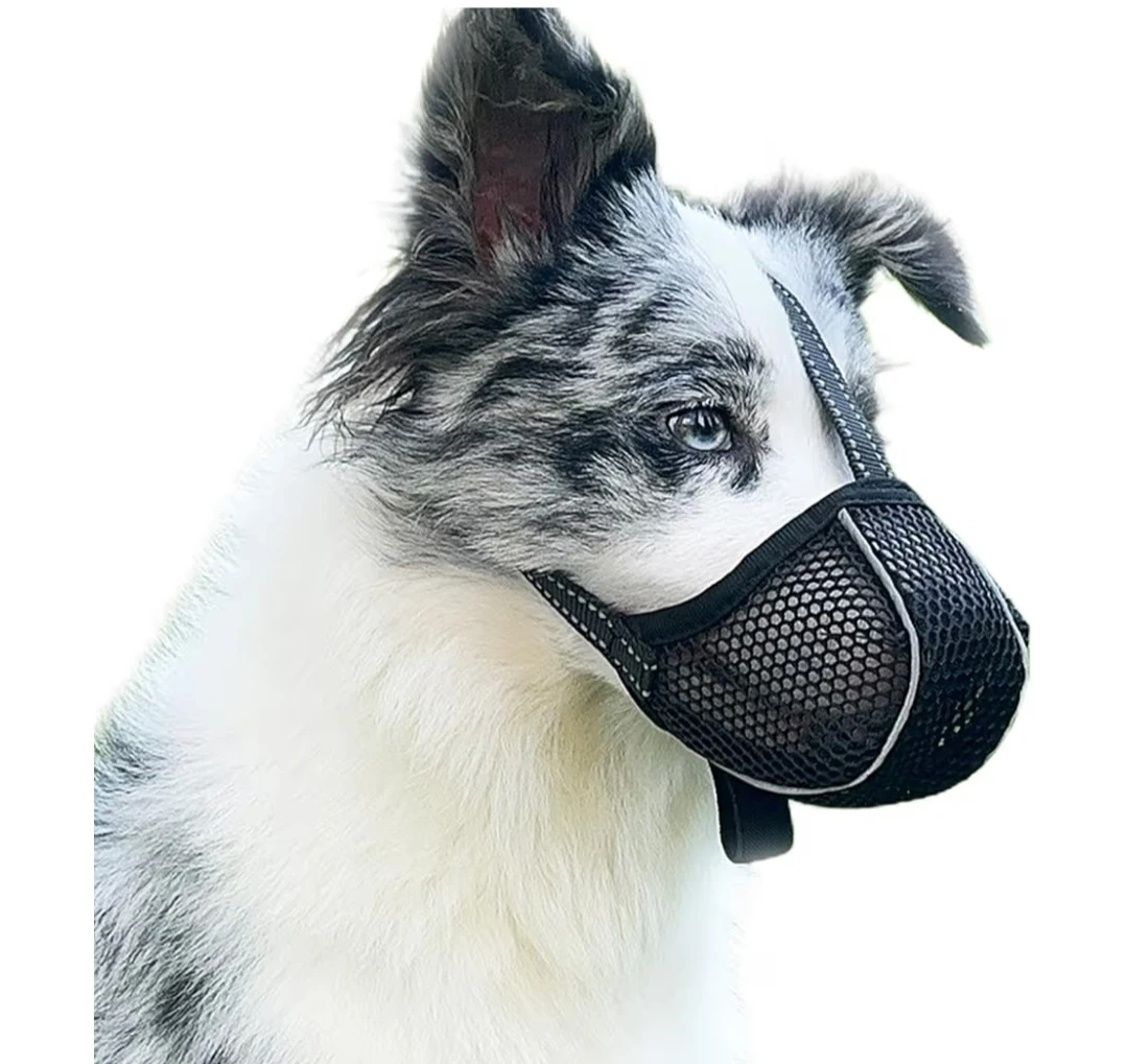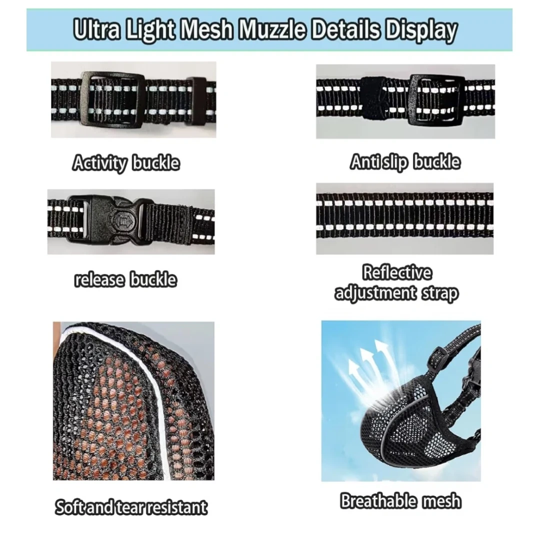 Breathable mesh dog muzzle with firm stitching and reflective straps. It features a quick-release buckle and adjustable straps for a secure fit. Collar loop included for daily collar attachment. Not suitable for short snout dogs.