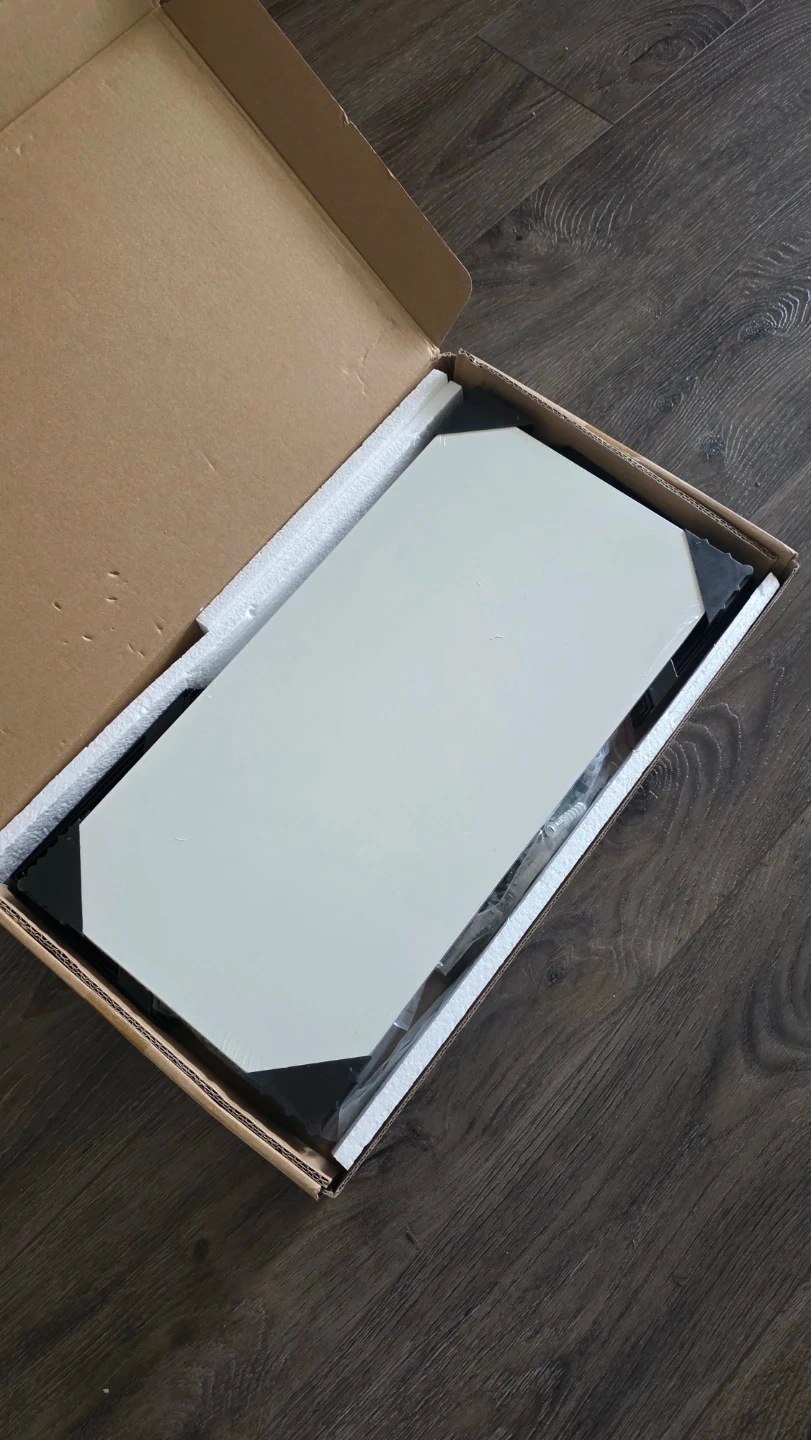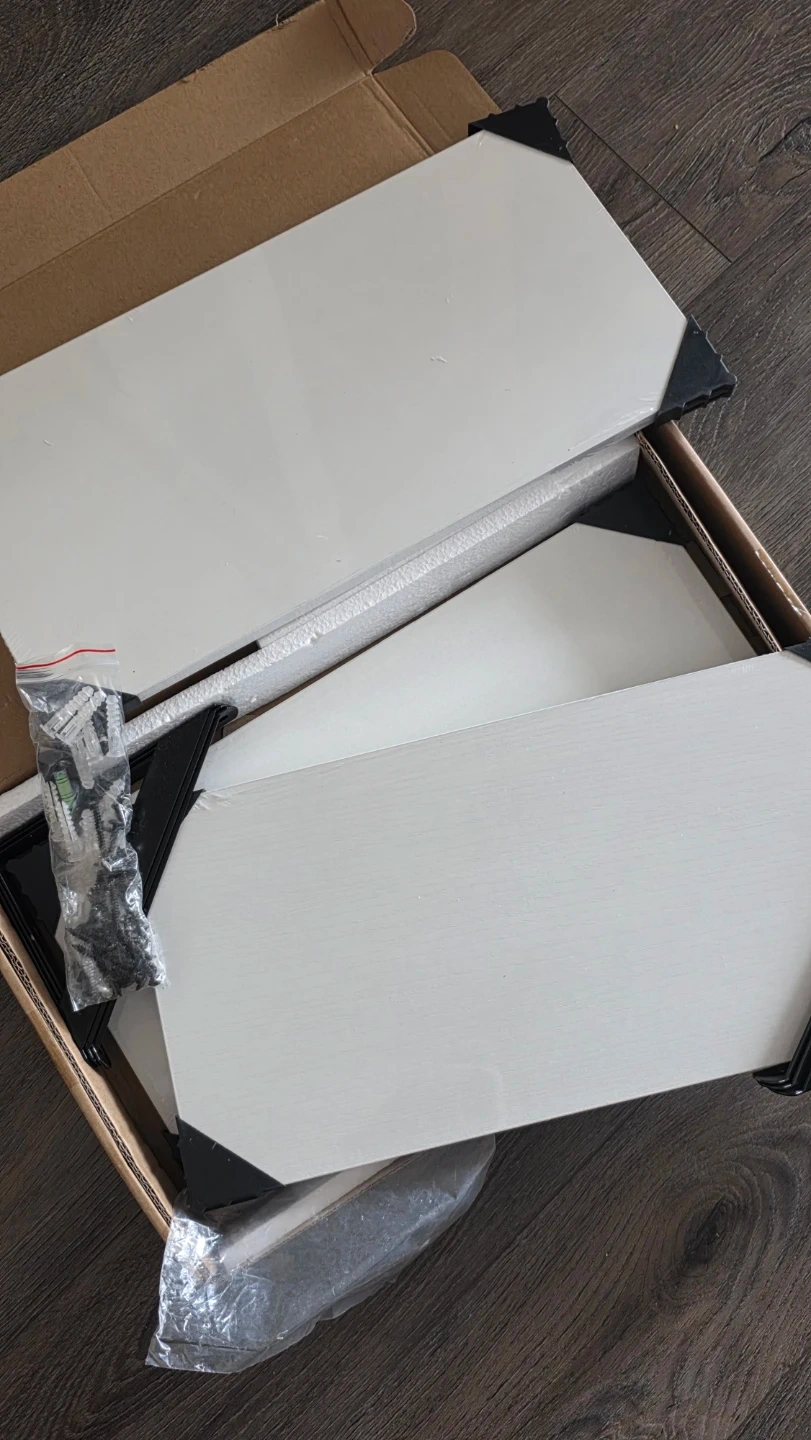 The box has been opened, but the shelves themselves are still sealed in a protective wrap. Mounting hardware is included for easy installation.