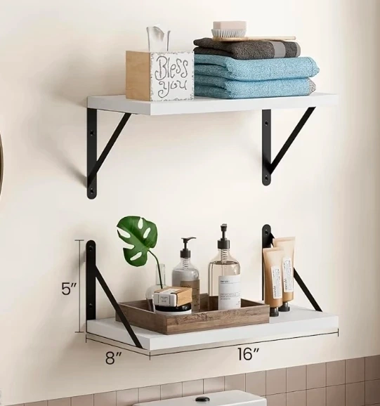 This set includes three white floating wall shelves with black brackets. Depending on your preference, you can assemble it up or down to create your unique shelf style.