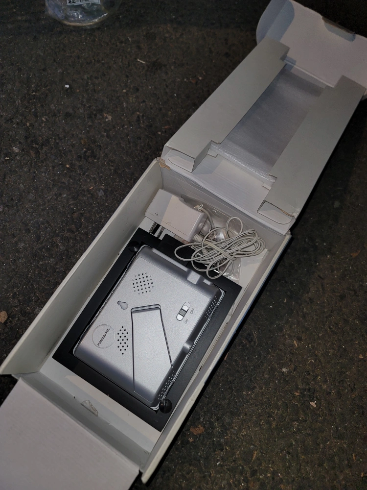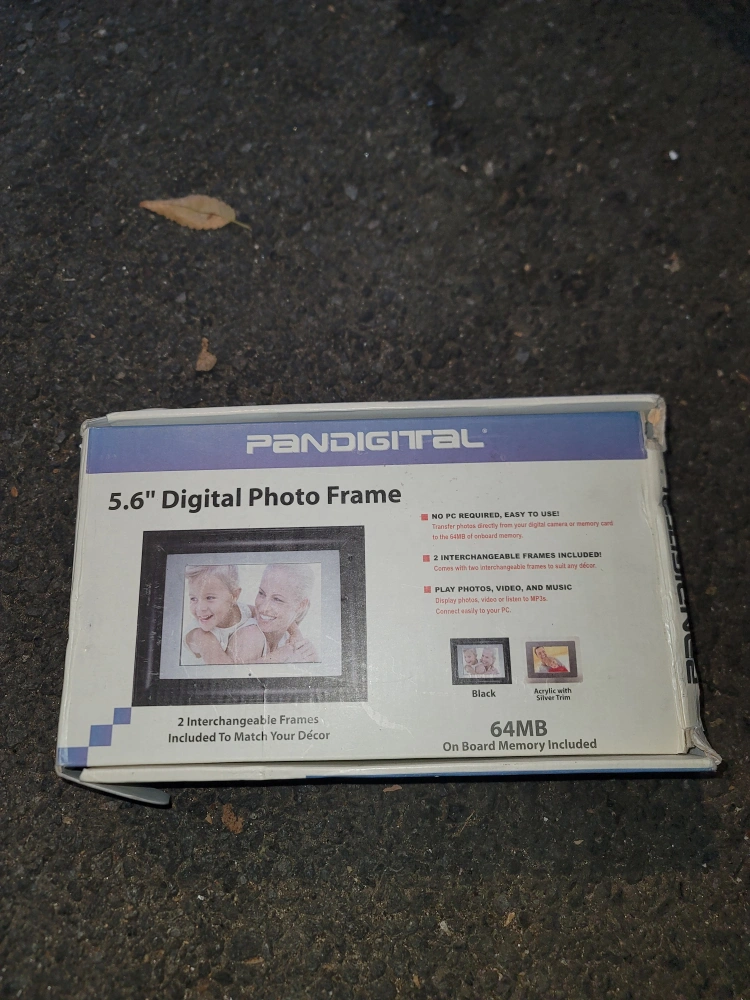 Digital photo frame with 64 MB of on board memory. Plays photos, videos, and music. Includes two interchangeable frames and power adapter.